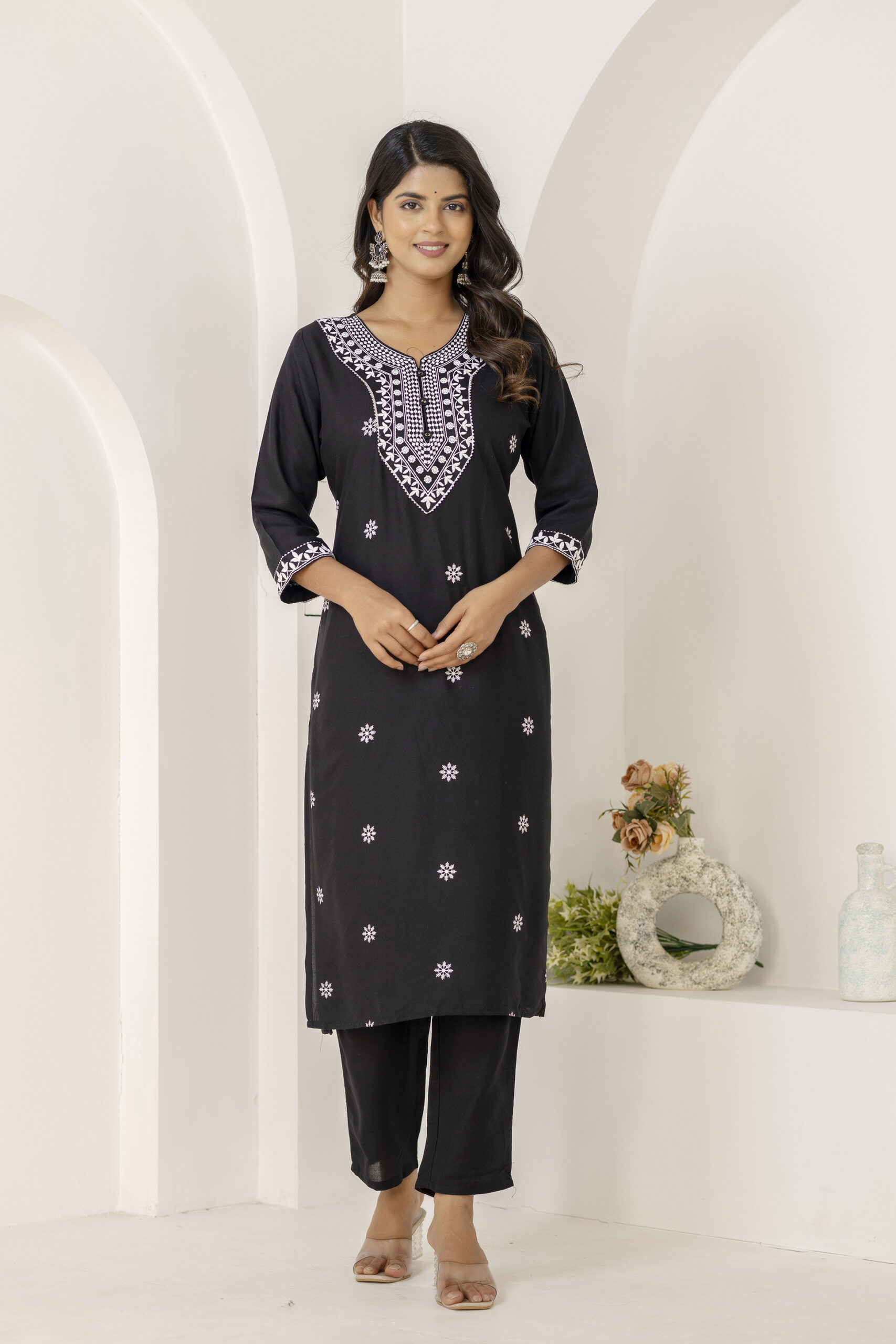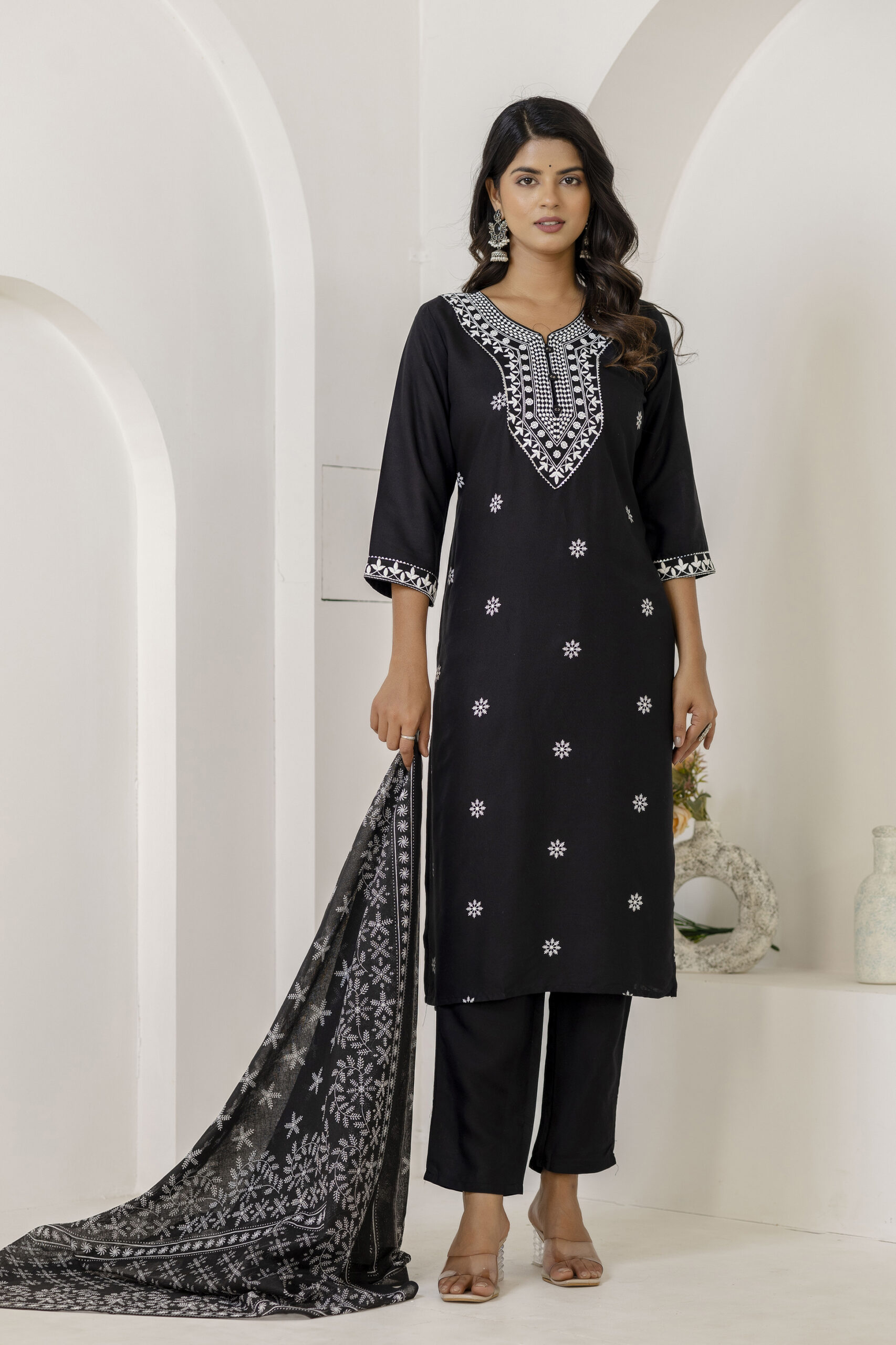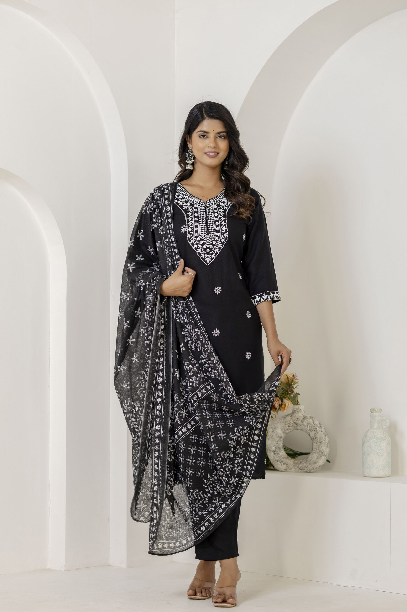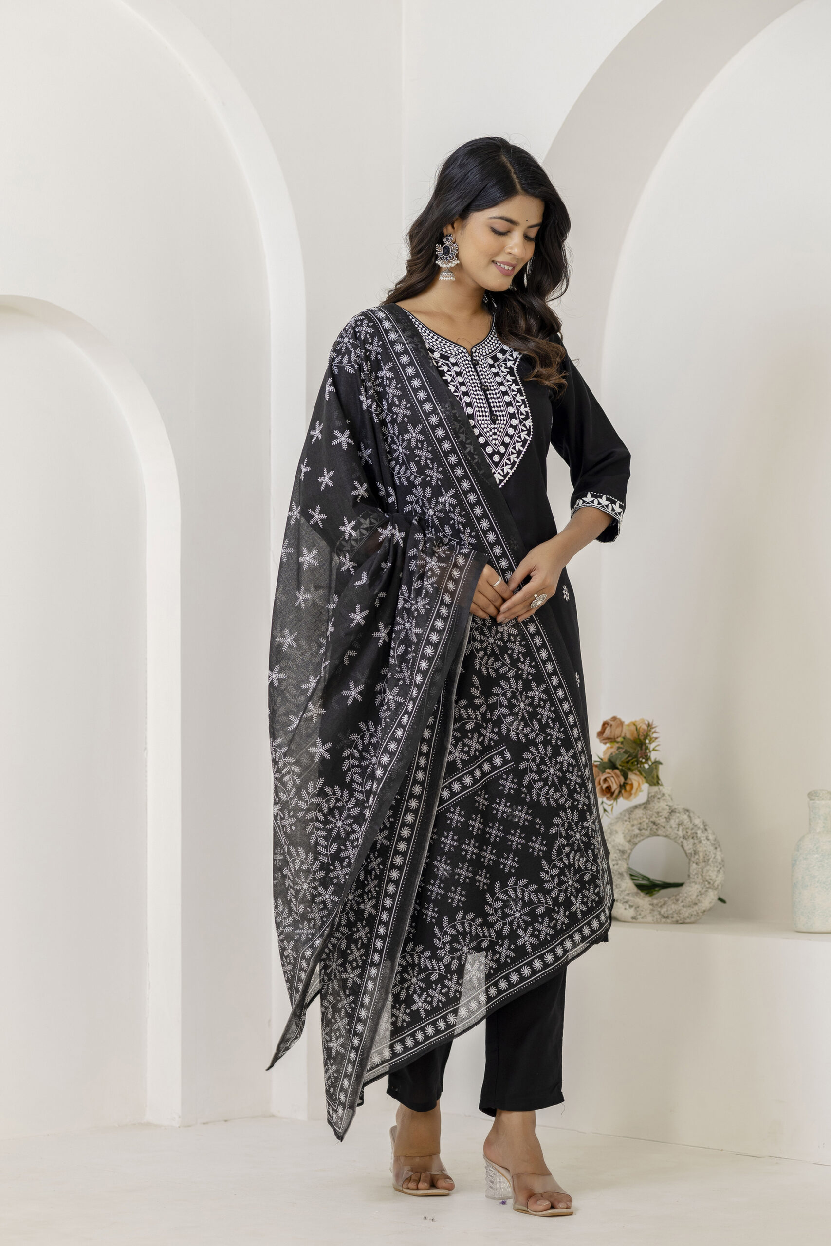 Black printed kurta set with matching pants and dupatta, crafted in breathable fabric for elegant everyday and festive ethnic wear.