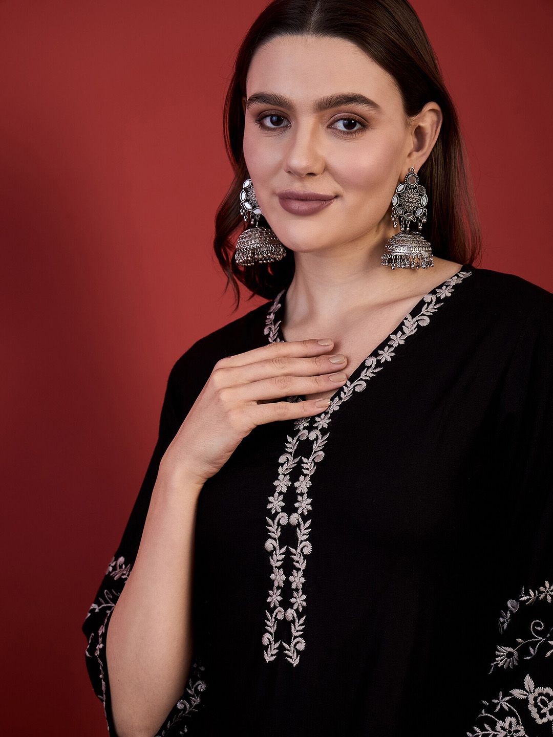 A timeless black kurti top featuring delicate white embroidery on the neckline and sleeves. Perfect for effortless everyday elegance and festive styling.