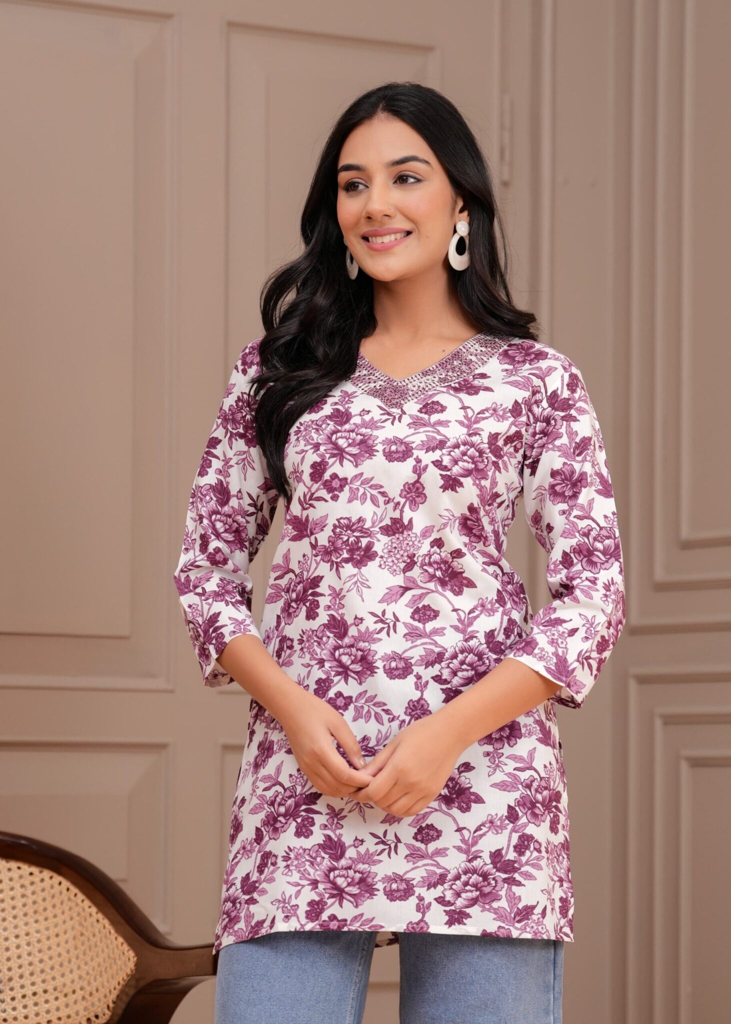 Its straight, flattering silhouette makes it versatile for both casual and semi-festive occasions. Pair it with palazzos, trousers, or jeans for a graceful yet modern look. Whether for office wear, family gatherings, or festive evenings, this kurti top blends comfort with elegance effortlessly.