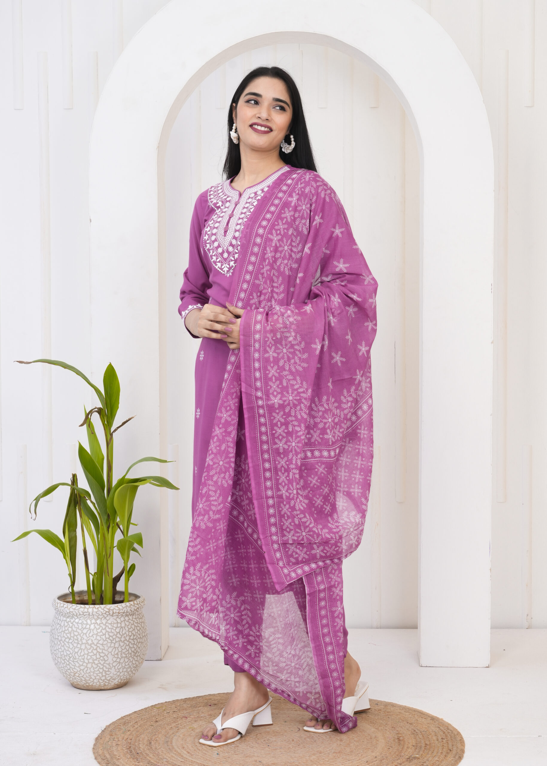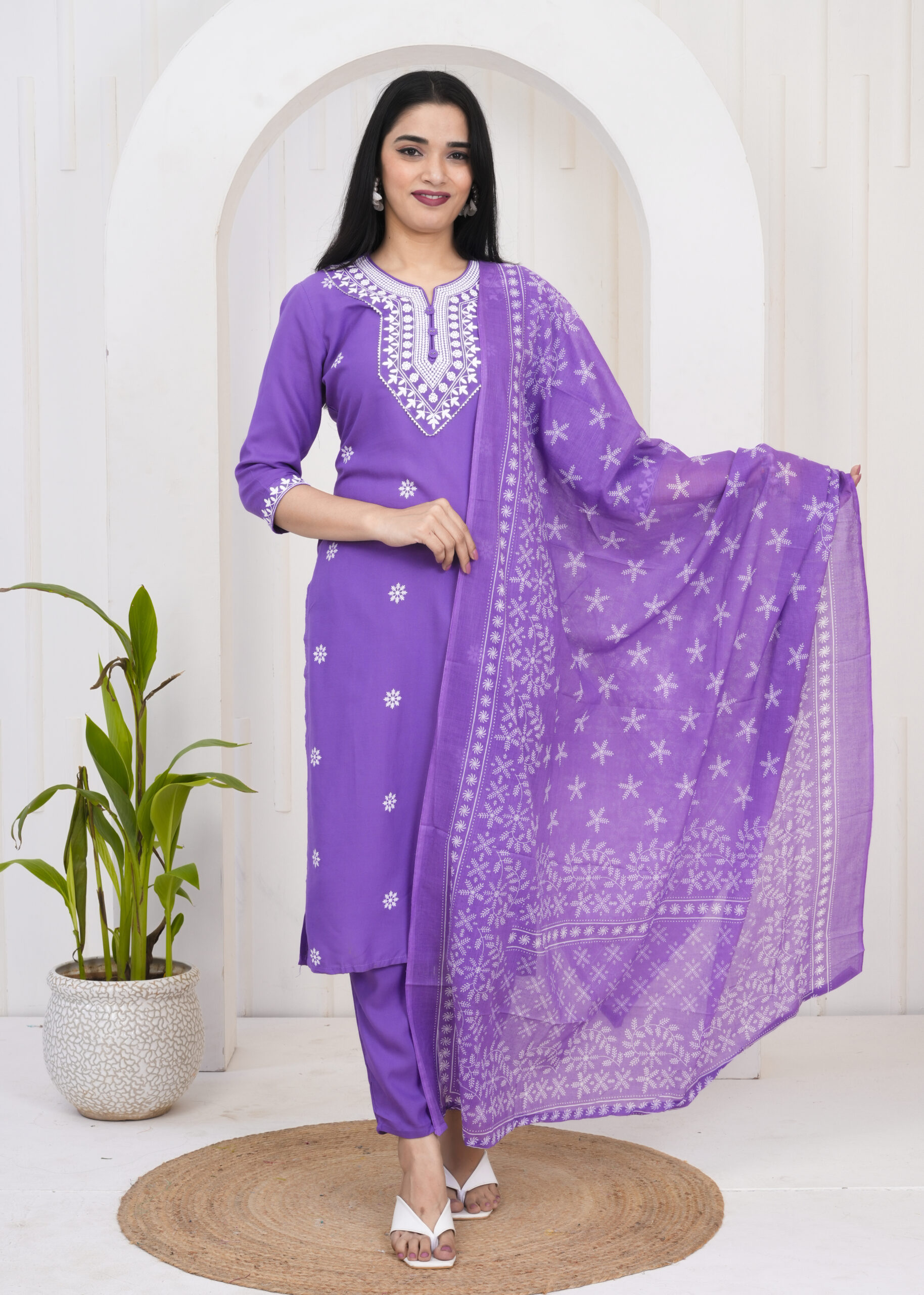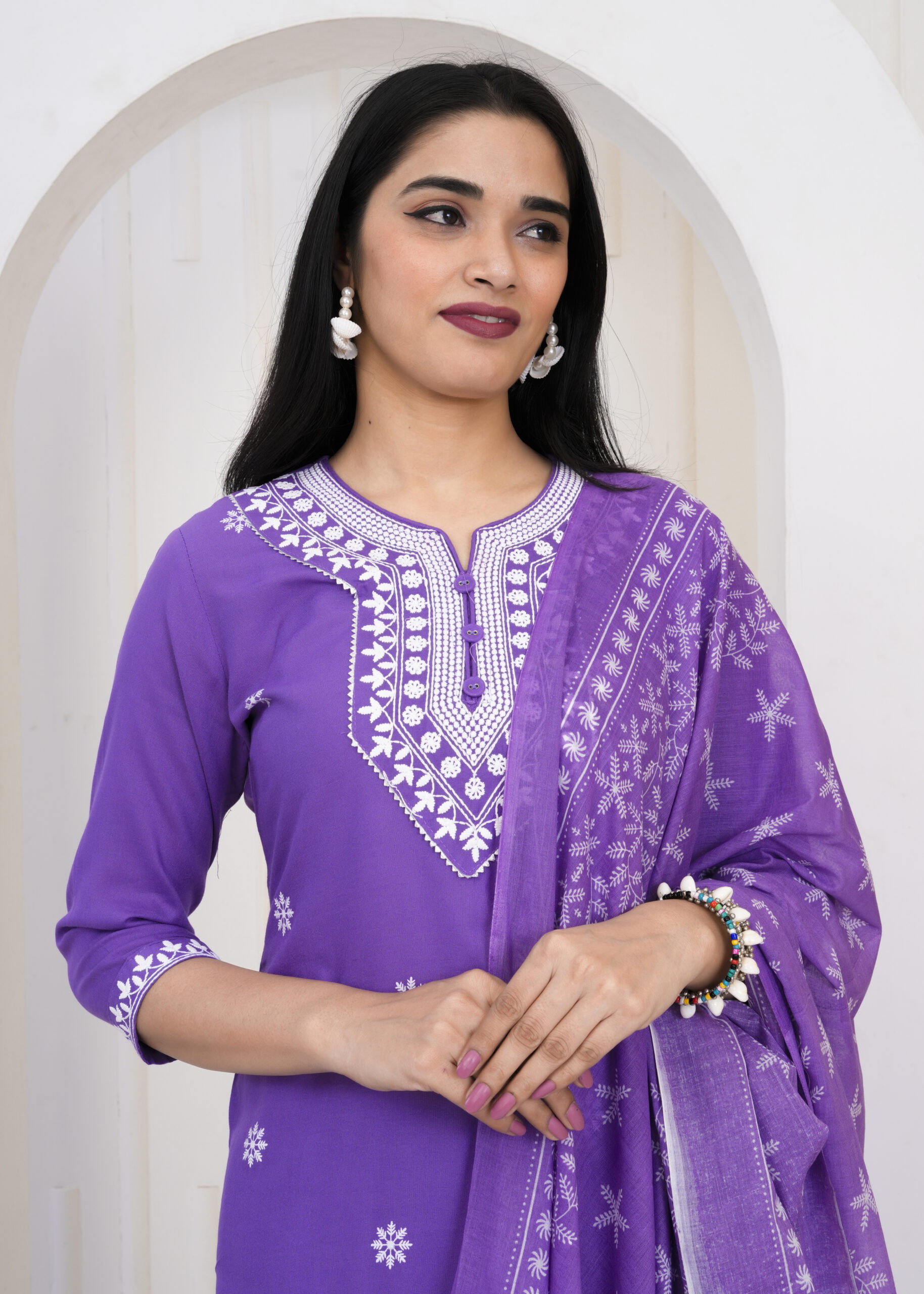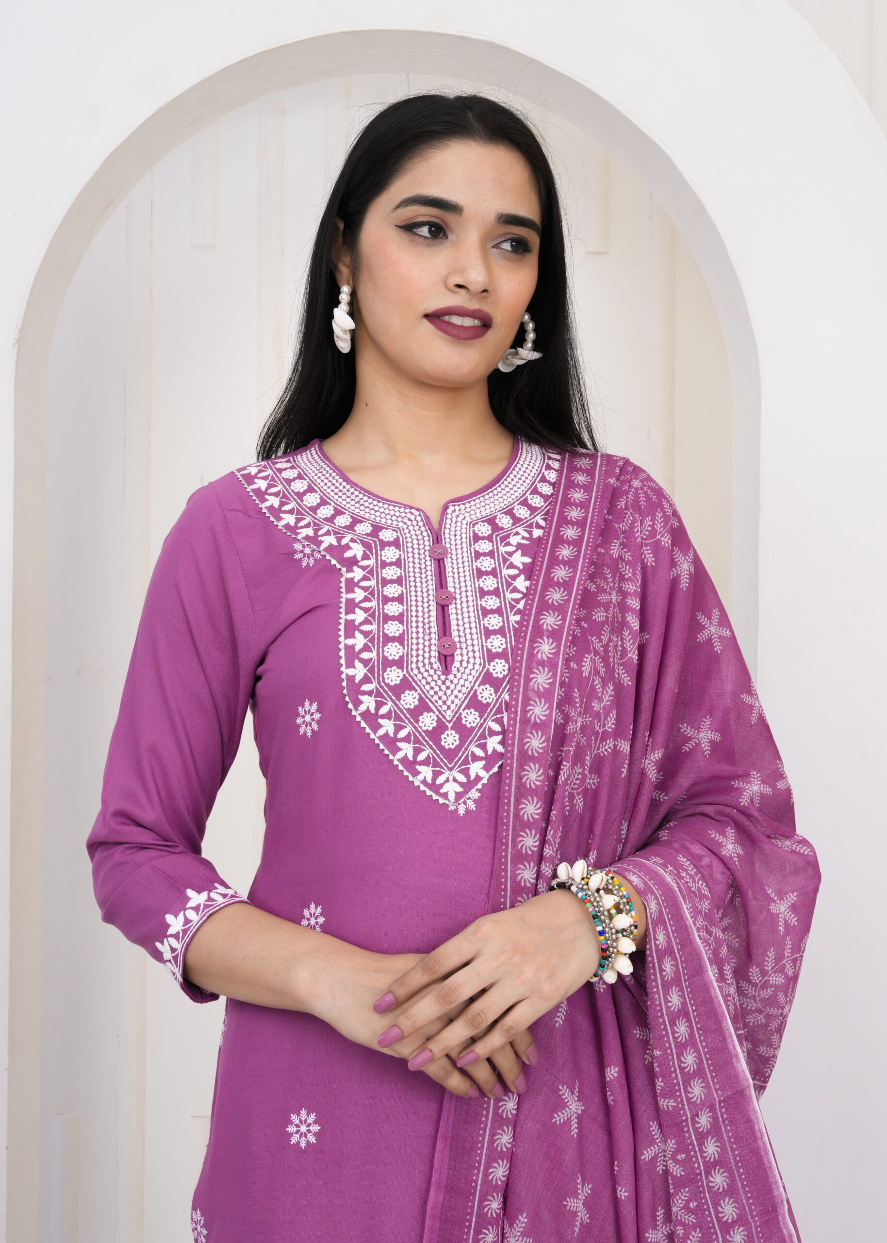 Add timeless charm to your ethnic wardrobe with this kurta set available in four premium colors, featuring delicate white embroidery on the neckline and subtle motifs across the kurta. Paired with matching pants and a soft printed dupatta, this set blends comfort with refined elegance, making it perfect for everyday wear as well as relaxed festive occasions.