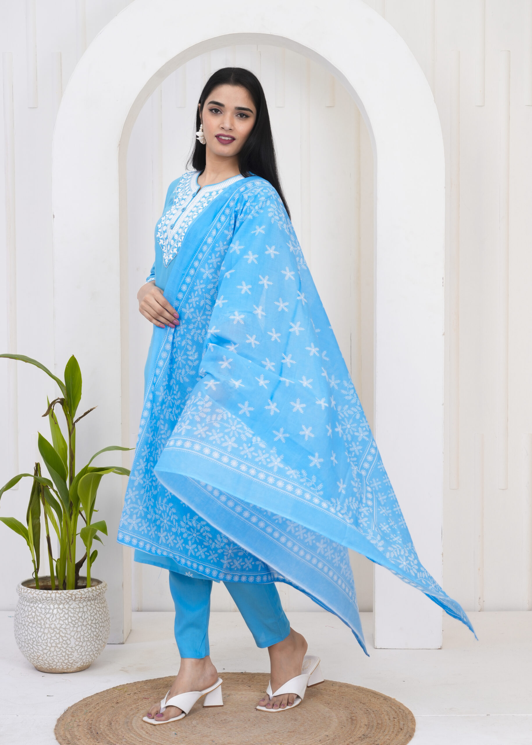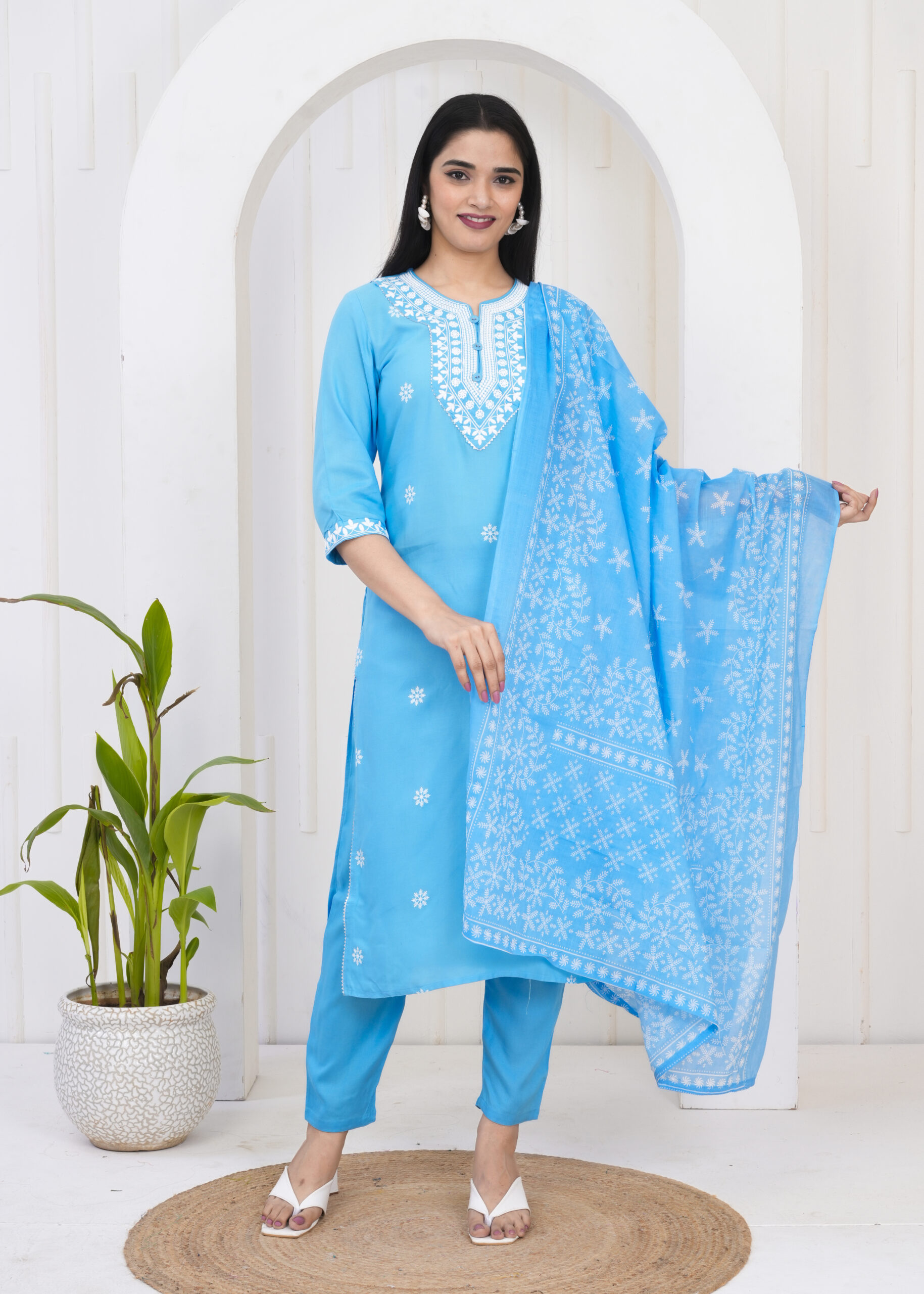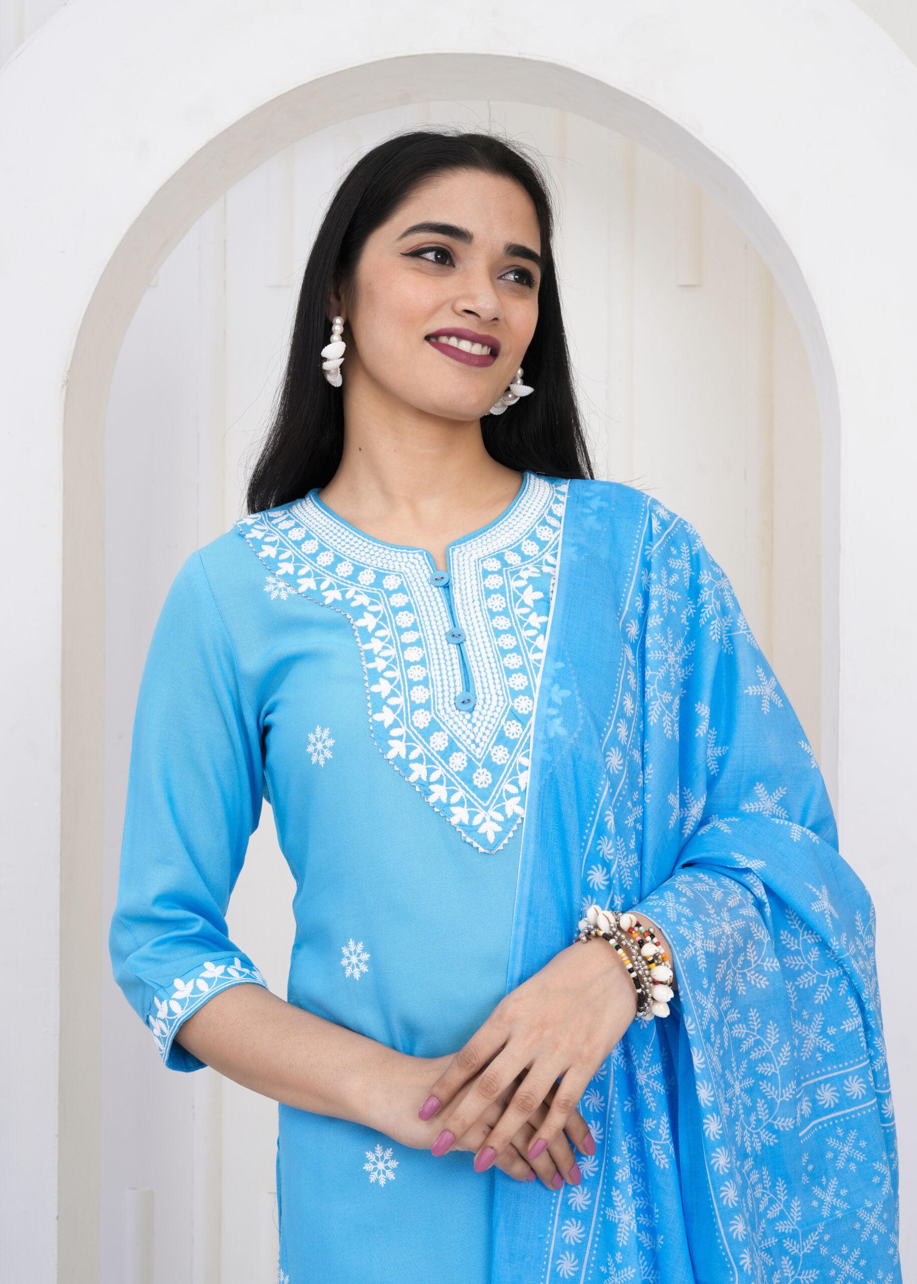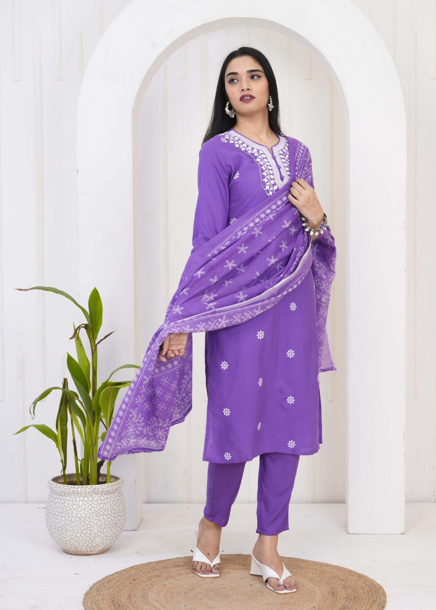 Add timeless charm to your ethnic wardrobe with this kurta set available in four premium colors, featuring delicate white embroidery on the neckline and subtle motifs across the kurta. Paired with matching pants and a soft printed dupatta, this set blends comfort with refined elegance, making it perfect for everyday wear as well as relaxed festive occasions.
