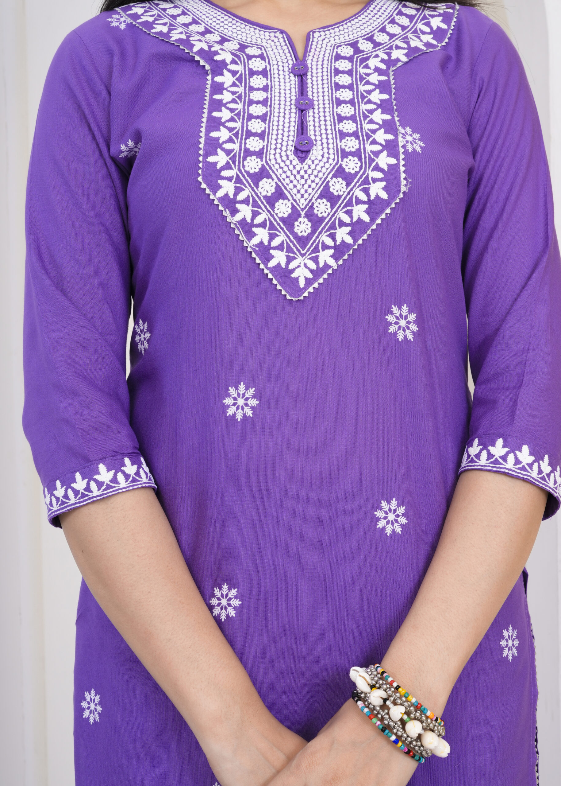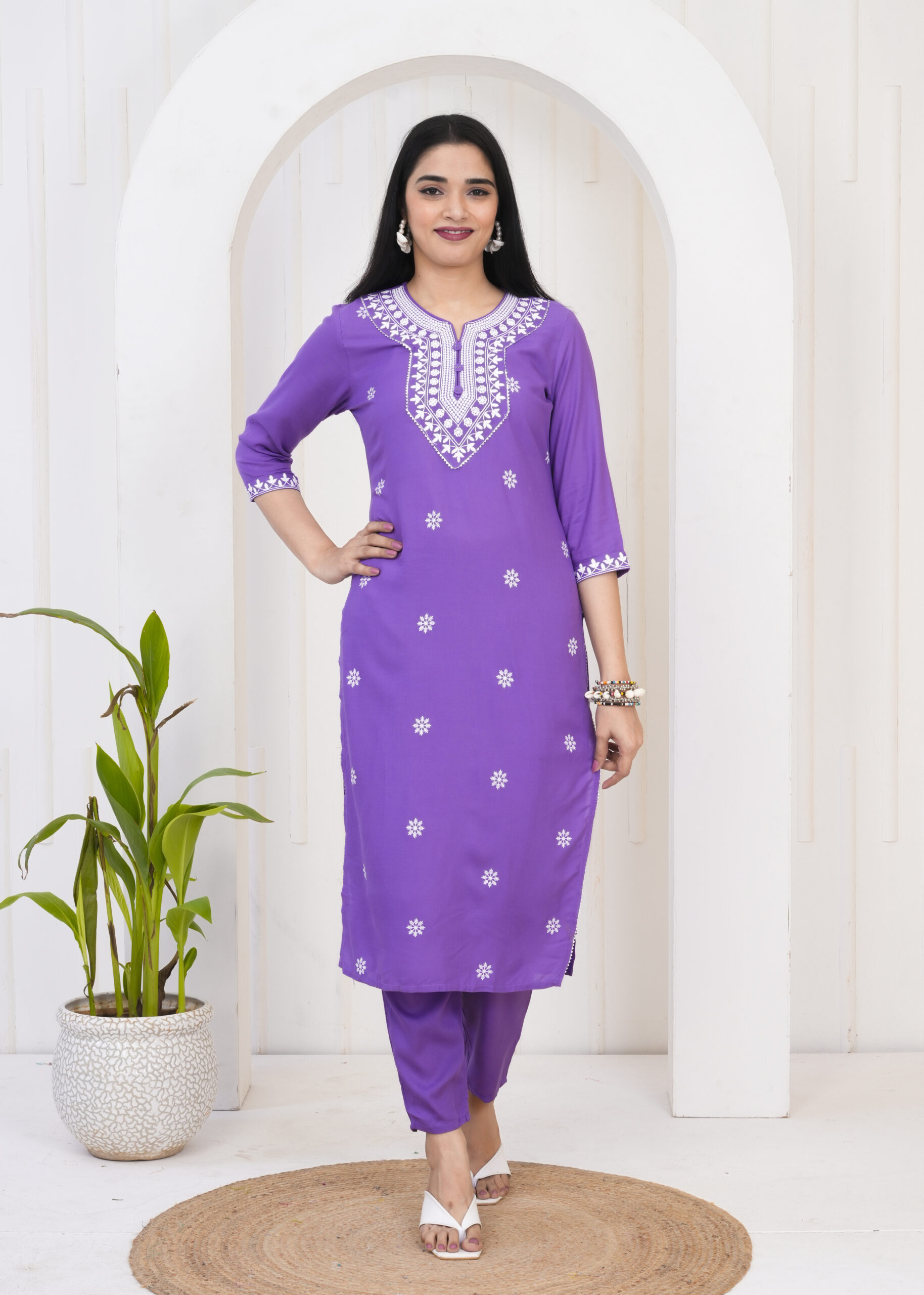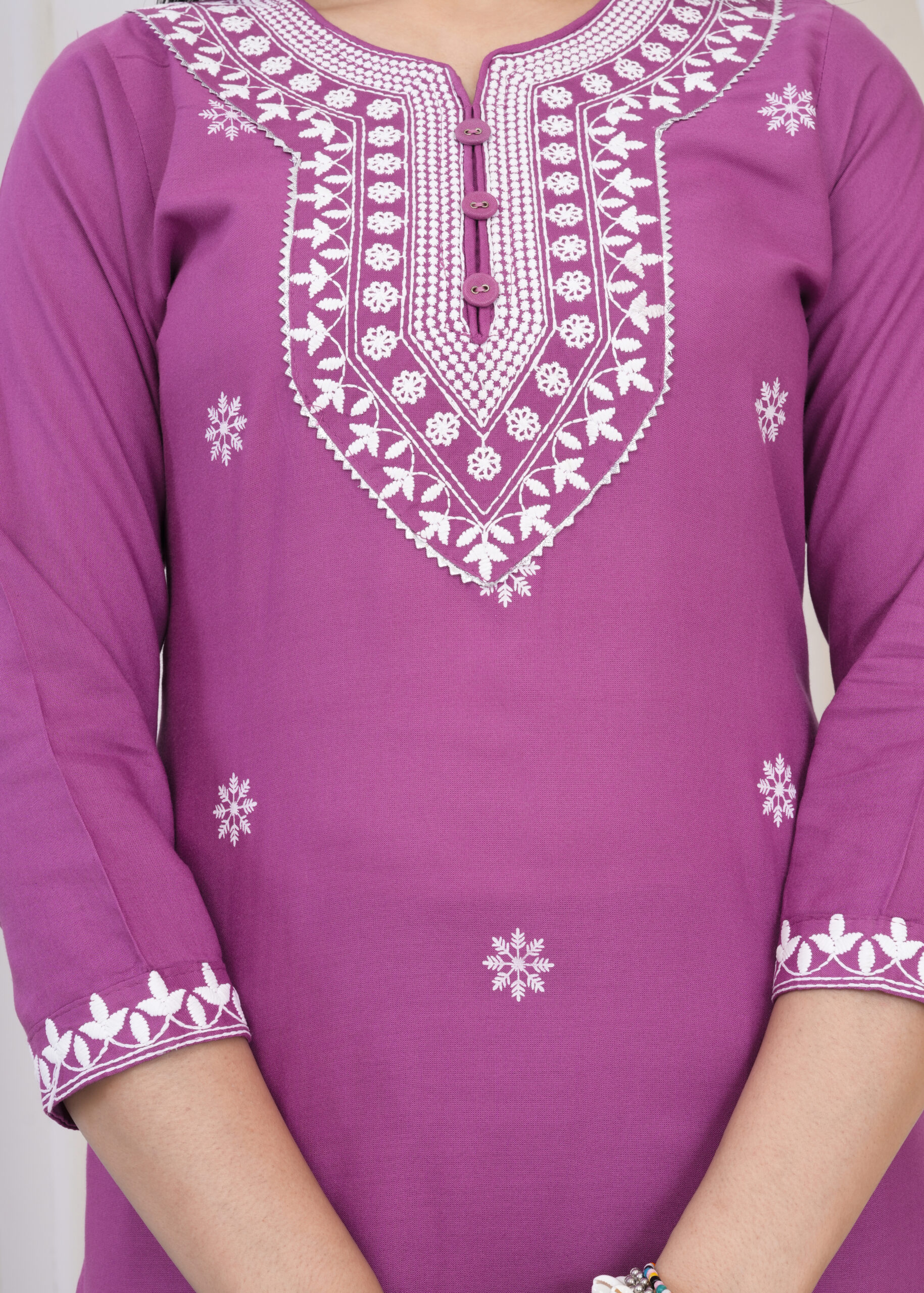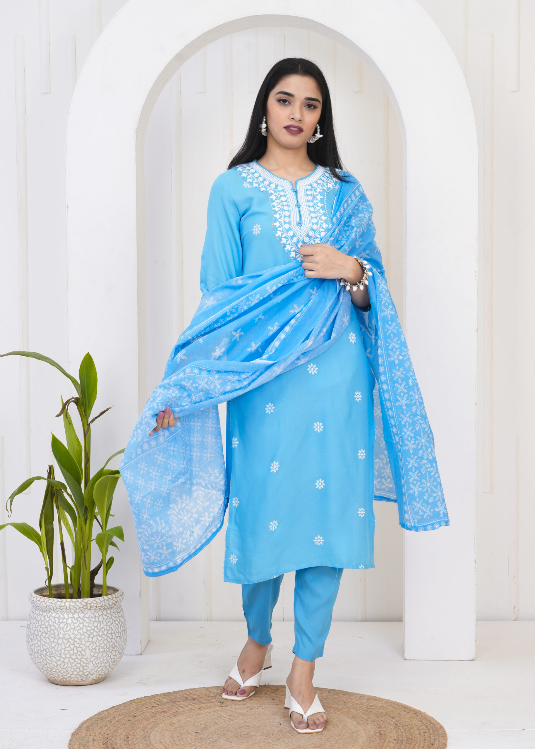 Add timeless charm to your ethnic wardrobe with this kurta set available in four premium colors, featuring delicate white embroidery on the neckline and subtle motifs across the kurta. Paired with matching pants and a soft printed dupatta, this set blends comfort with refined elegance, making it perfect for everyday wear as well as relaxed festive occasions.