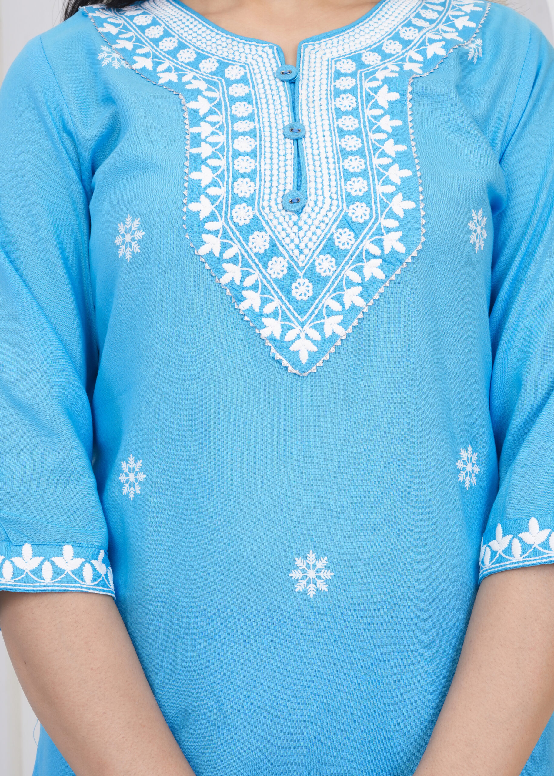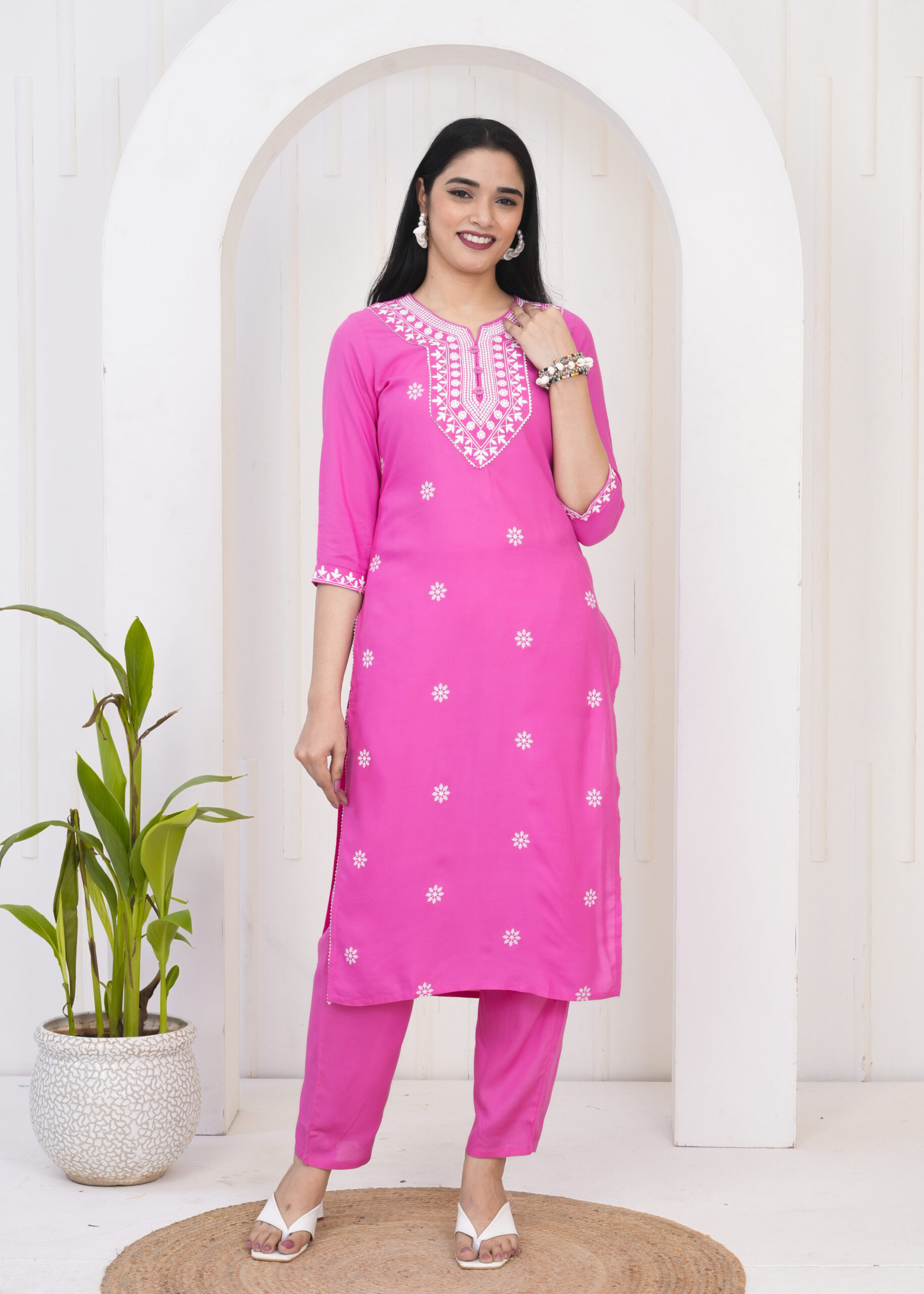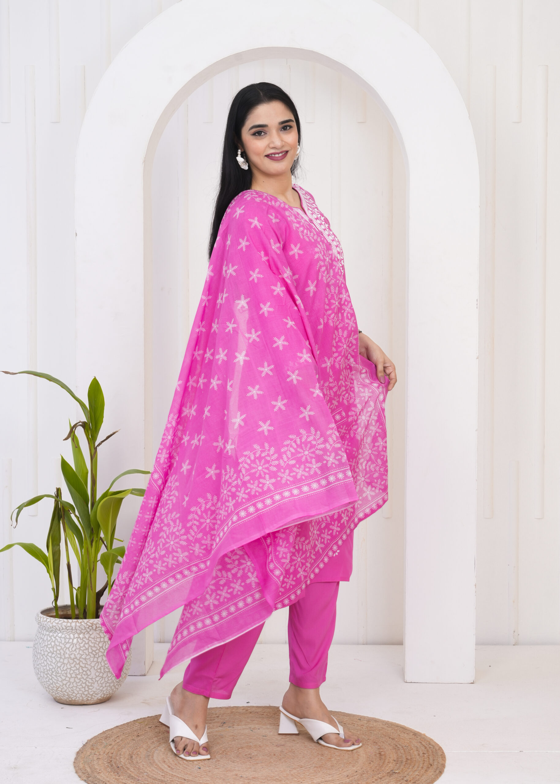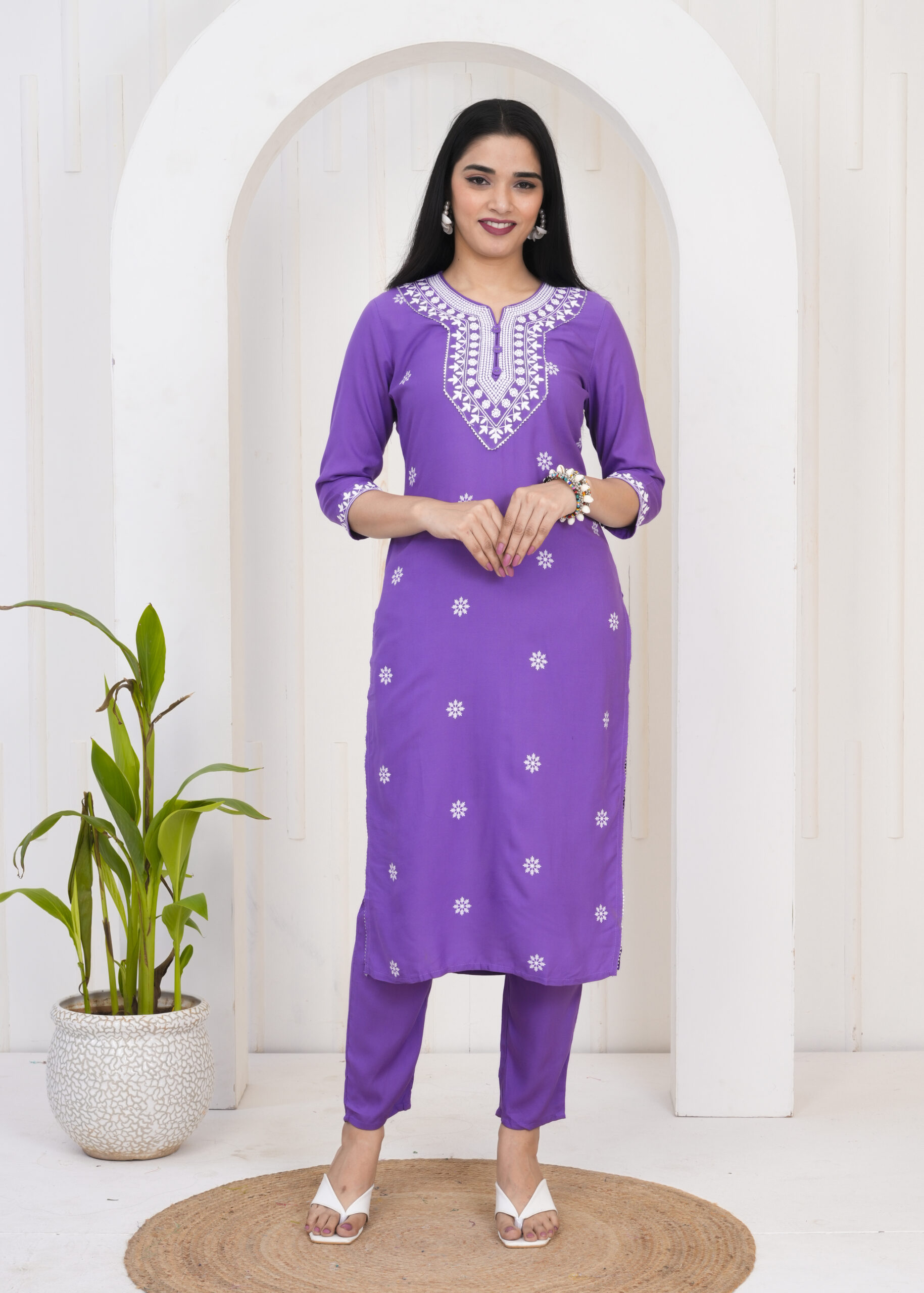 Add timeless charm to your ethnic wardrobe with this kurta set available in four premium colors, featuring delicate white embroidery on the neckline and subtle motifs across the kurta. Paired with matching pants and a soft printed dupatta, this set blends comfort with refined elegance, making it perfect for everyday wear as well as relaxed festive occasions.