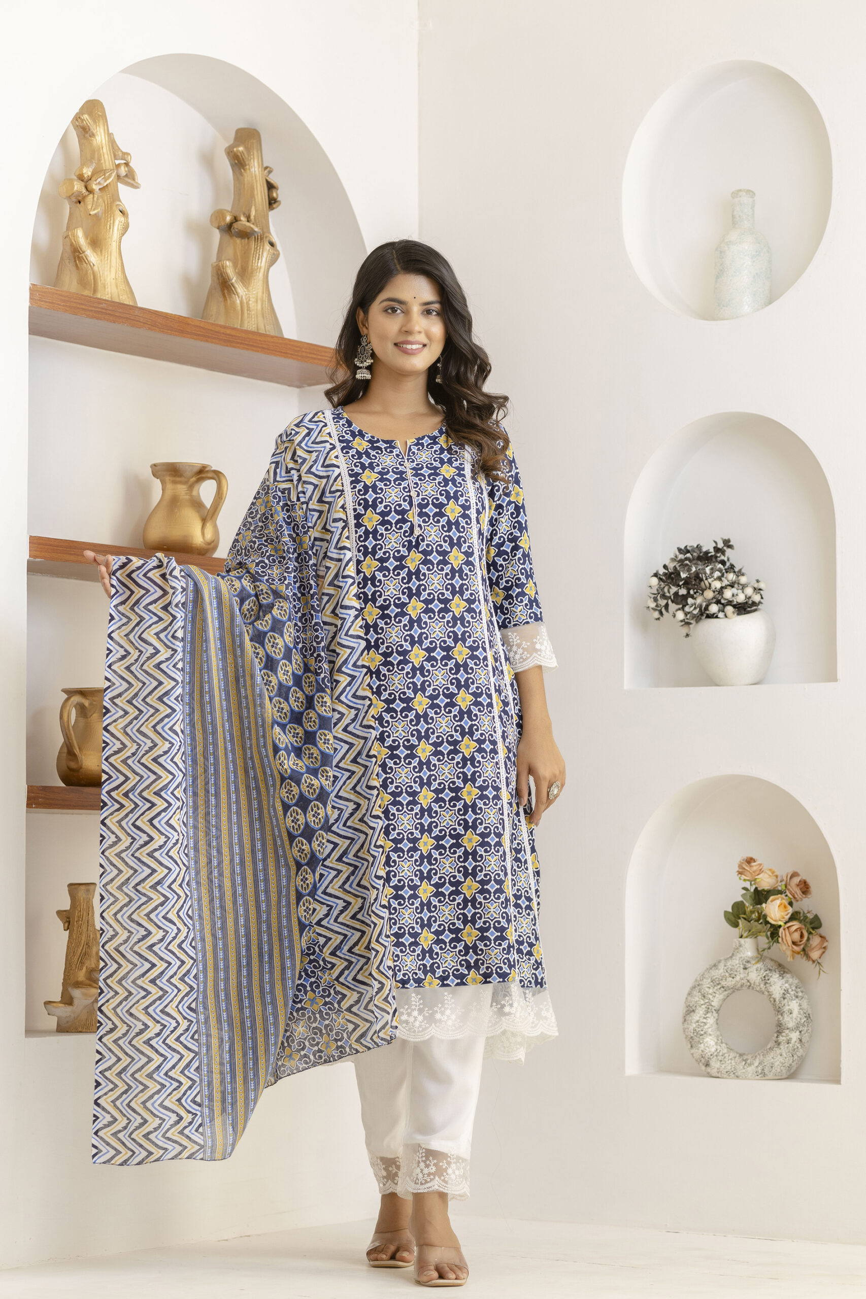 Elevate your ethnic wardrobe with this elegant indigo blue printed kurta set, designed with intricate geometric and floral-inspired motifs. The straight-cut kurta is paired with soft white pants featuring delicate lace detailing and a beautifully coordinated printed dupatta that adds contrast and charm. Light, breathable, and effortlessly stylish, this set is perfect for refined everyday wear and special daytime occasions.