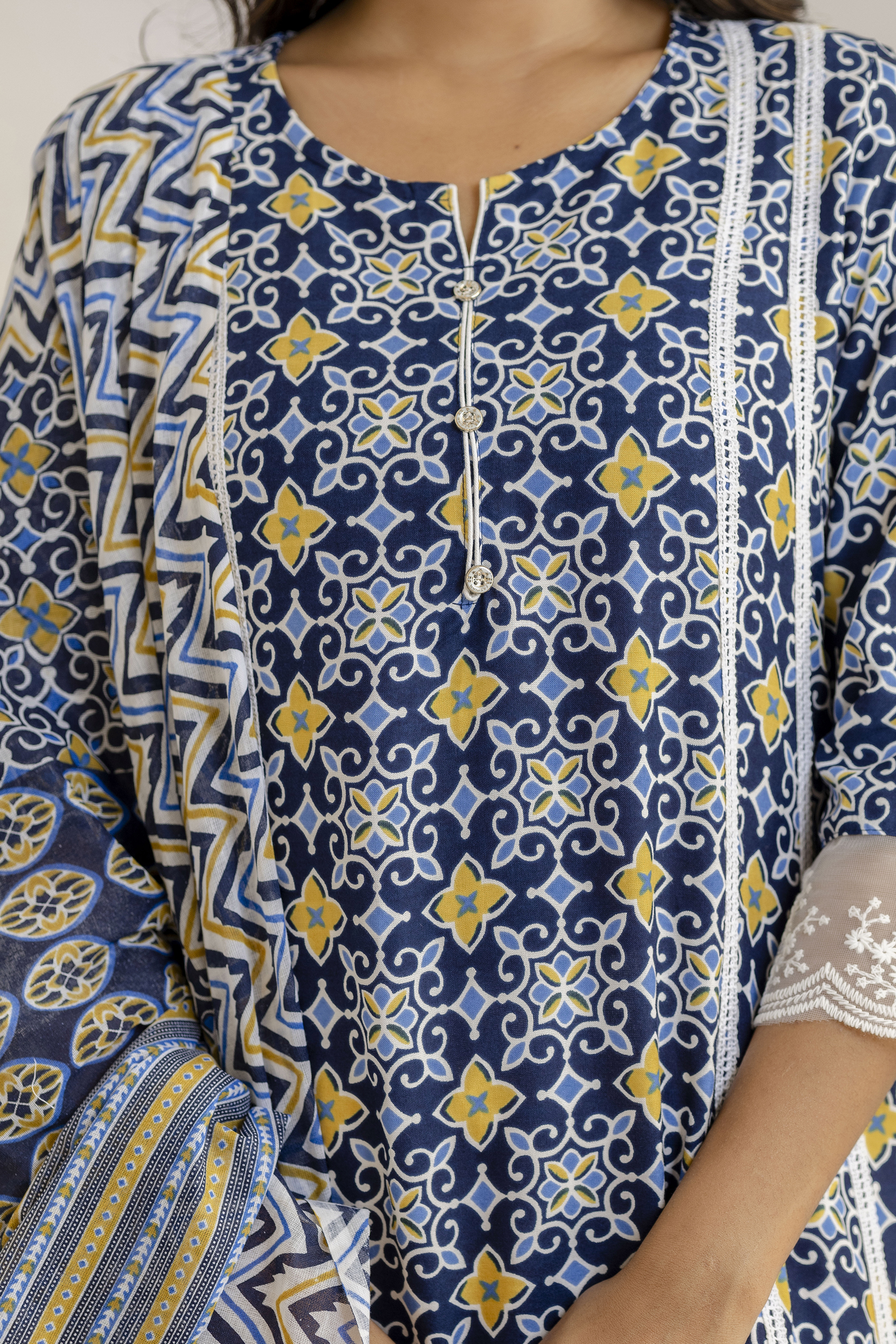 Indigo blue printed kurta set with white pants and a coordinated dupatta, crafted in breathable fabric for elegant everyday and festive wear.