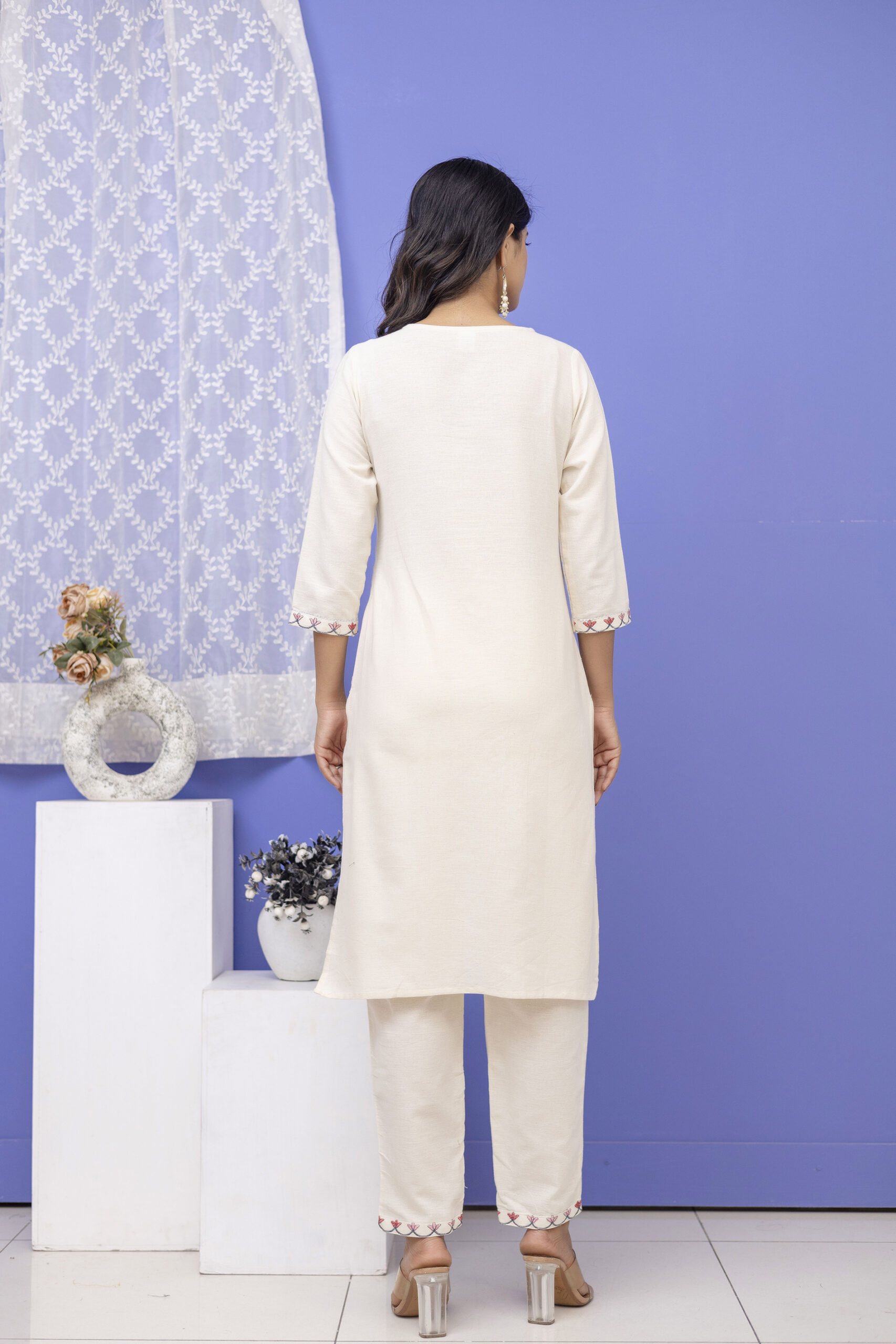Step into effortless grace with this ivory kurta set, beautifully paired with a vibrant pink printed dupatta. The kurta features delicate floral embroidery on the yoke, adding a refined handcrafted touch, while the soft straight-fit silhouette ensures all-day comfort. Finished with coordinated pants and a statement dupatta, this set is ideal for elegant everyday wear and light festive occasions.