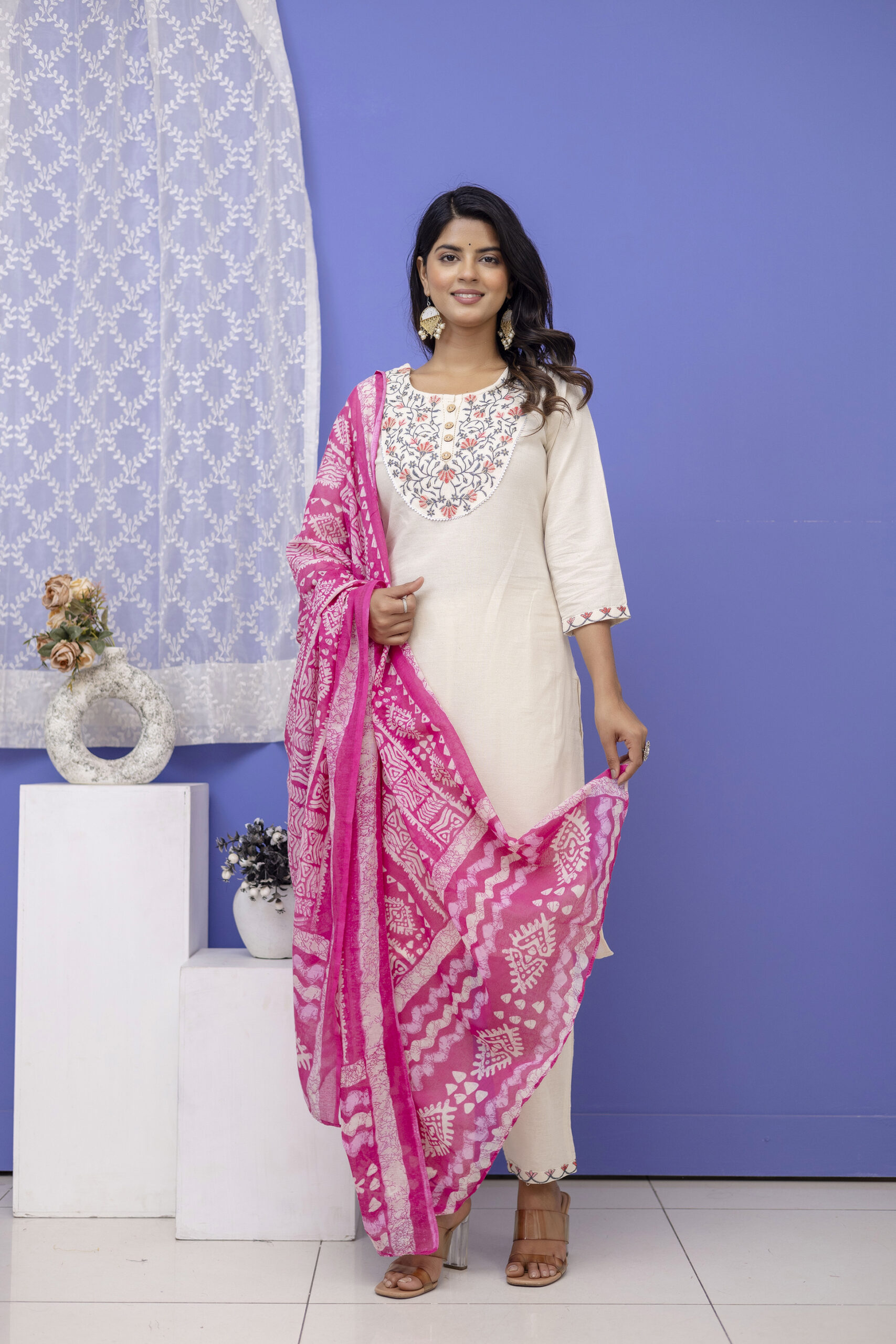 Ivory kurta set with embroidered yoke, matching pants, and a pink printed dupatta, perfect for elegant everyday and festive ethnic wear.