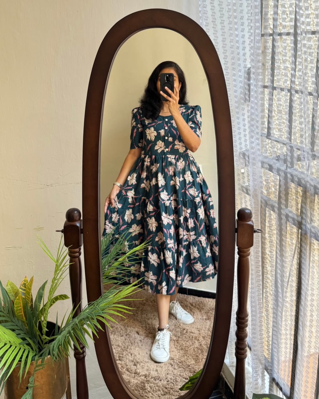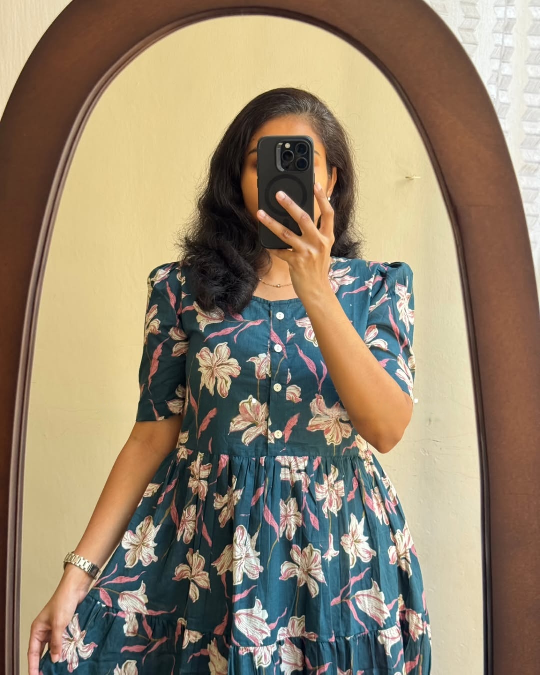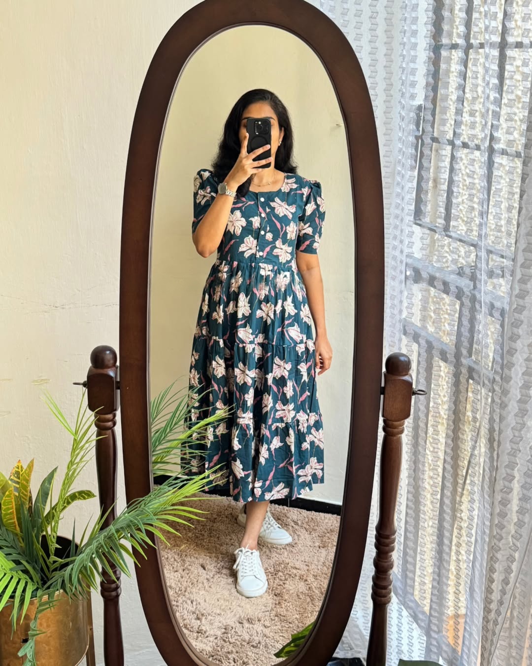 A beautifully crafted midi dress in a deep teal base adorned with soft floral prints, designed for effortless elegance. Featuring a classic round neckline with front button detailing, short sleeves, and a flowing tiered silhouette, this dress offers comfort with a refined feminine charm. Perfect for everyday wear with a polished, graceful finish.