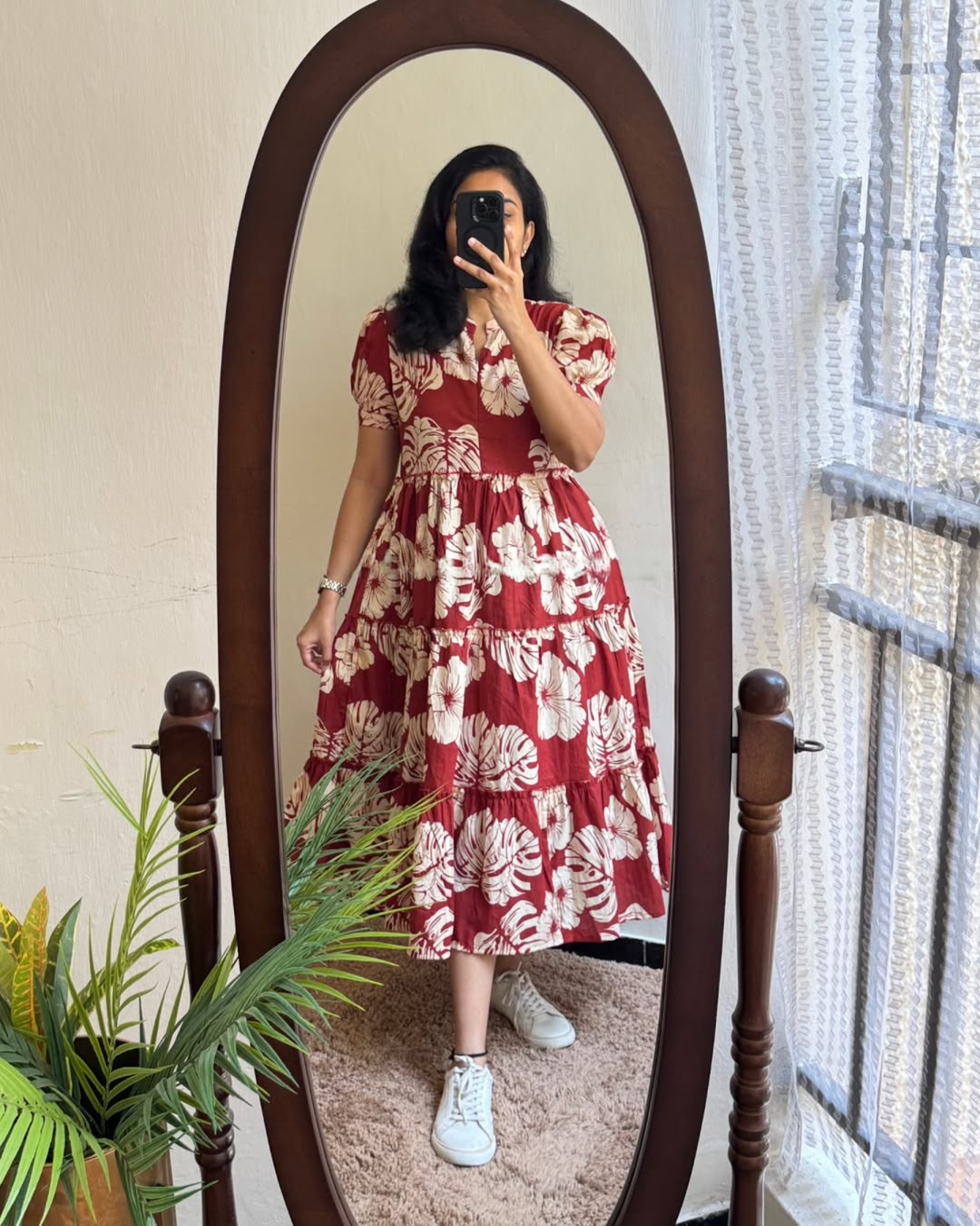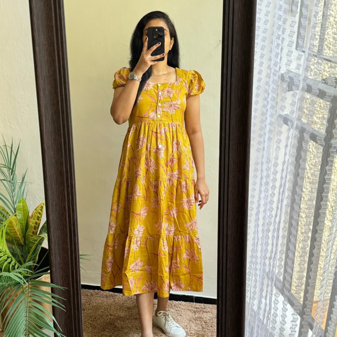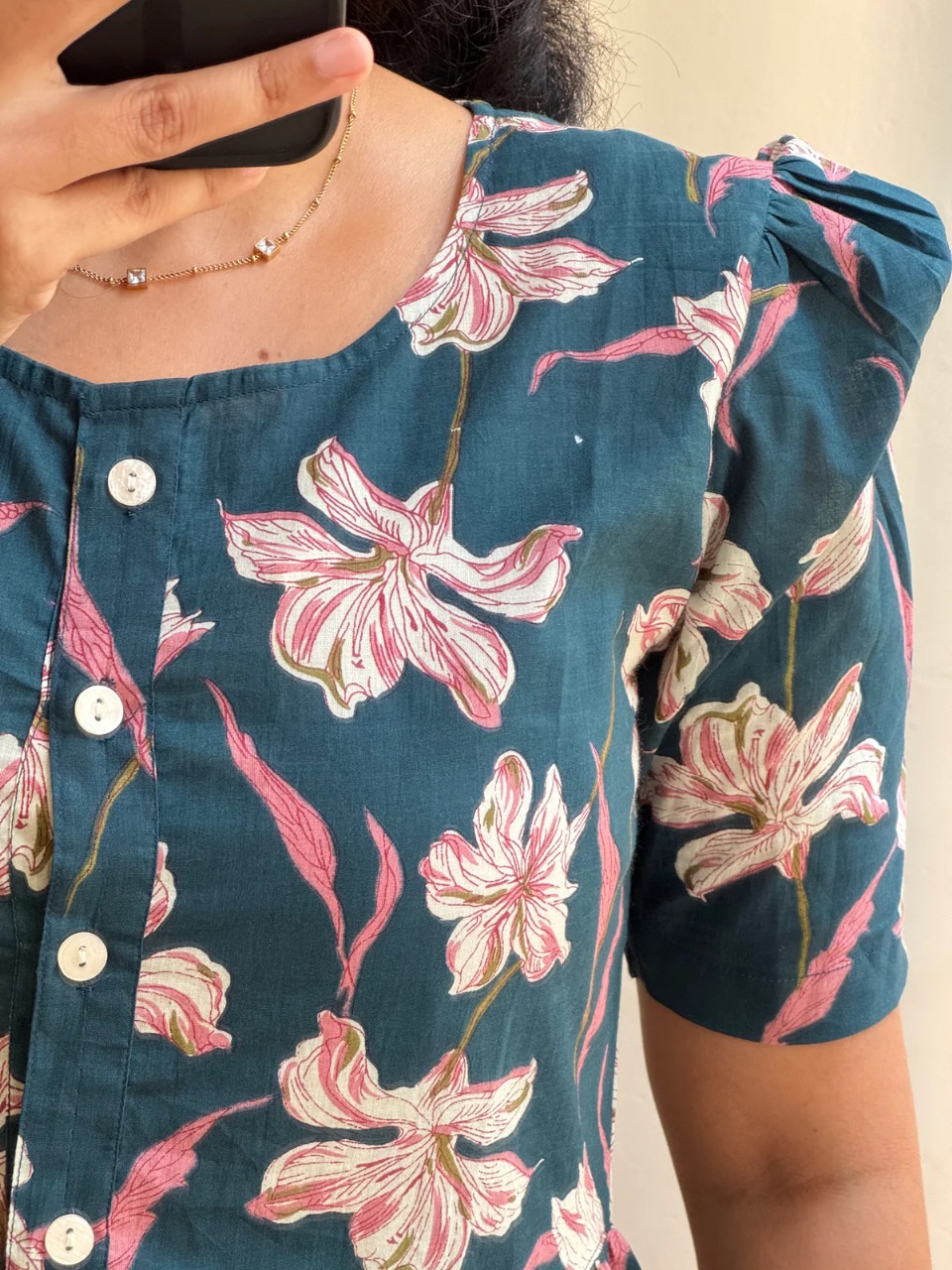 A beautifully crafted midi dress in a deep teal base adorned with soft floral prints, designed for effortless elegance. Featuring a classic round neckline with front button detailing, short sleeves, and a flowing tiered silhouette, this dress offers comfort with a refined feminine charm. Perfect for everyday wear with a polished, graceful finish.