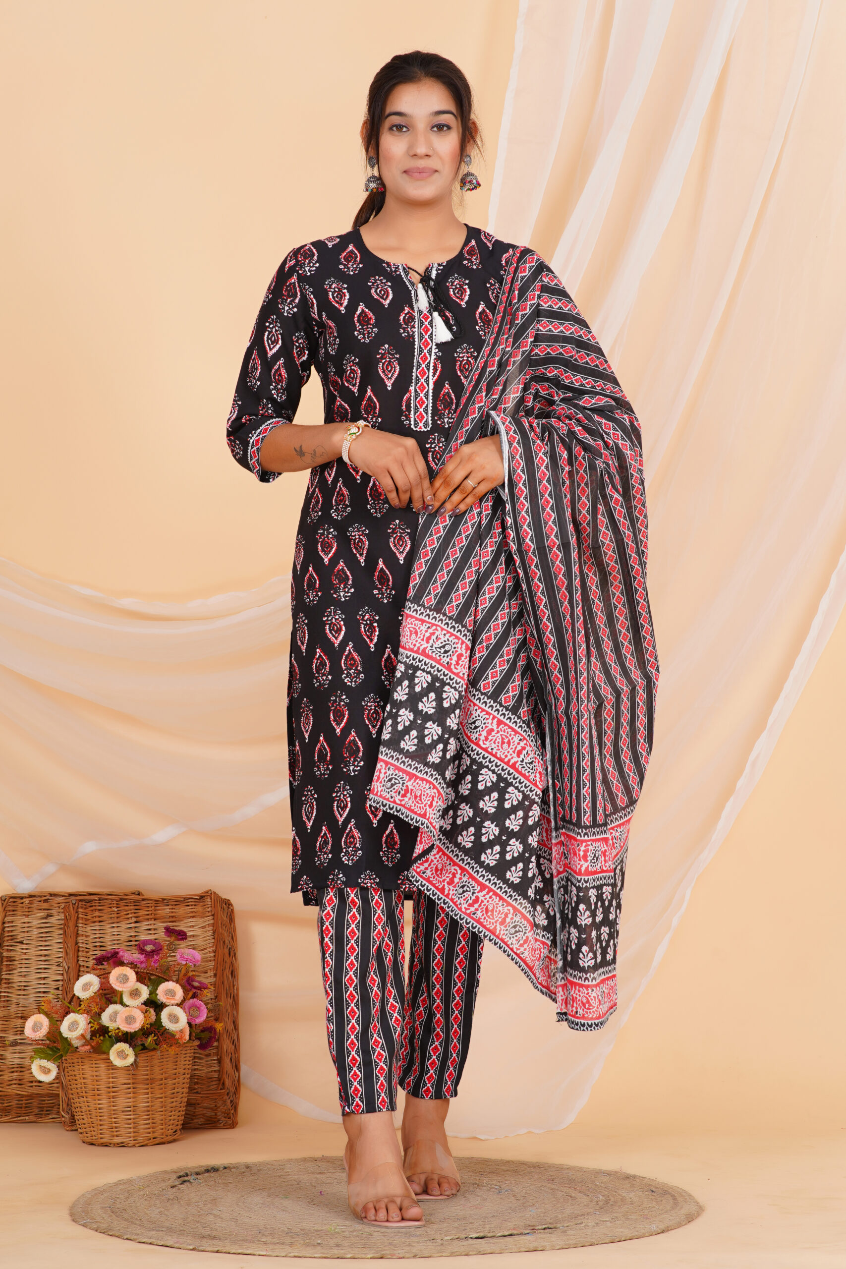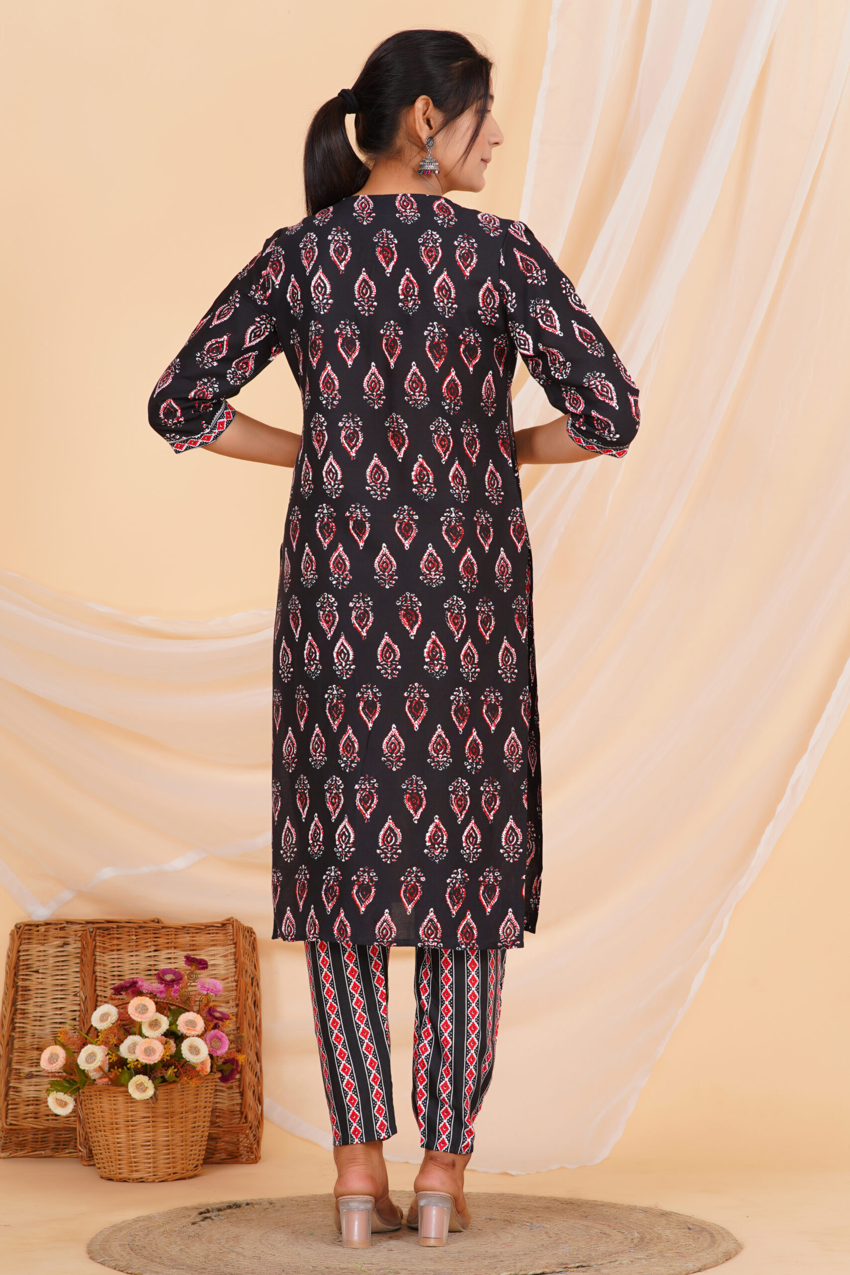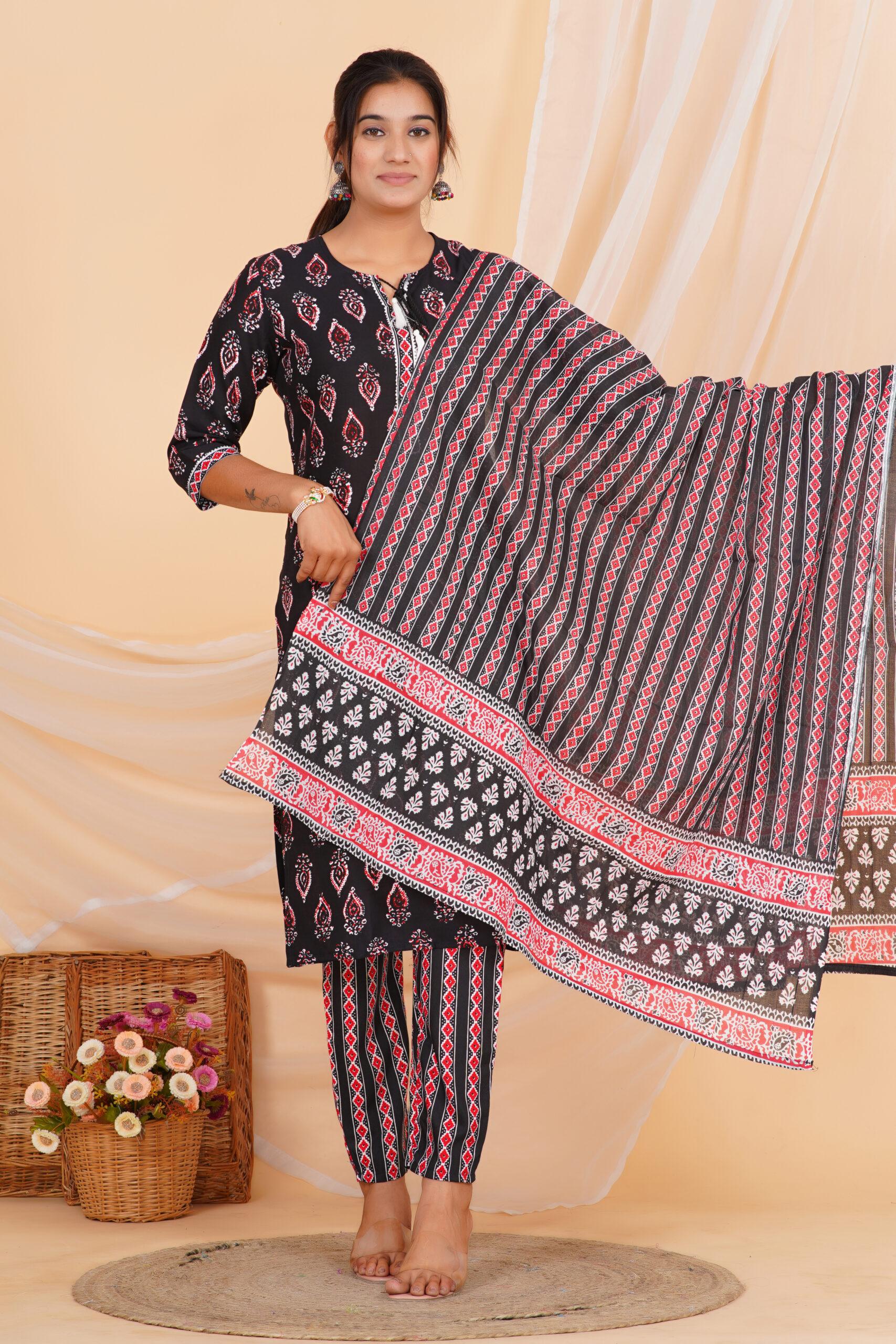A striking kurta set designed in a deep black base, highlighted with classic red and white motifs that add depth and character. The straight-cut kurta is paired with coordinated printed pants and a beautifully patterned dupatta that completes the look with balanced contrast. Comfortable, breathable, and effortlessly stylish — perfect for daily ethnic wear with a refined edge.