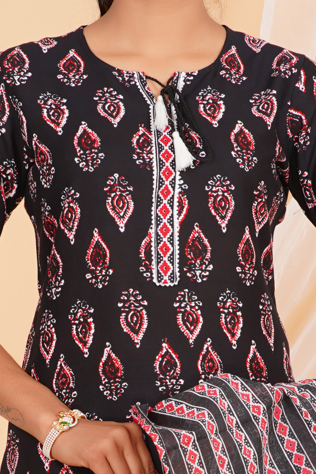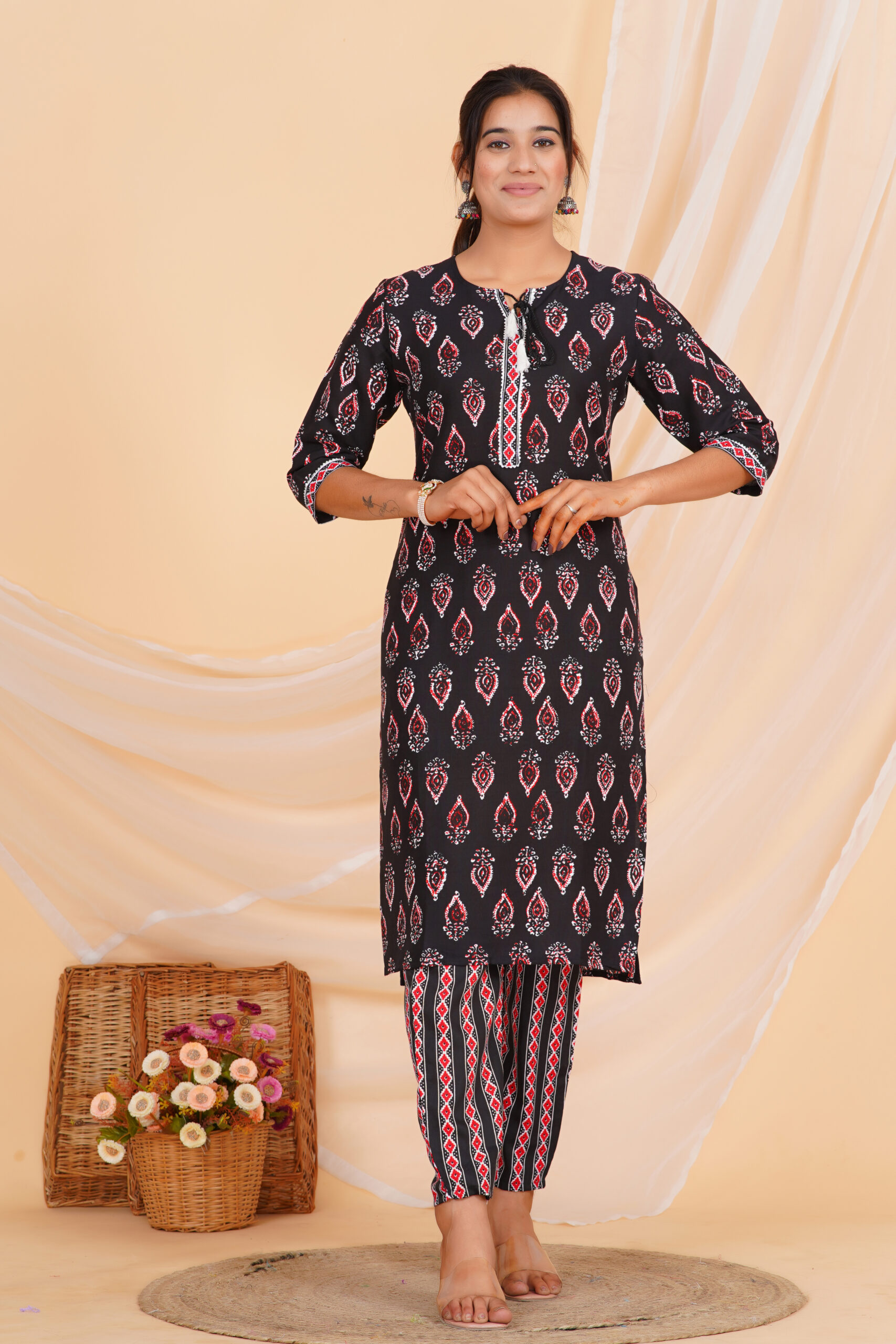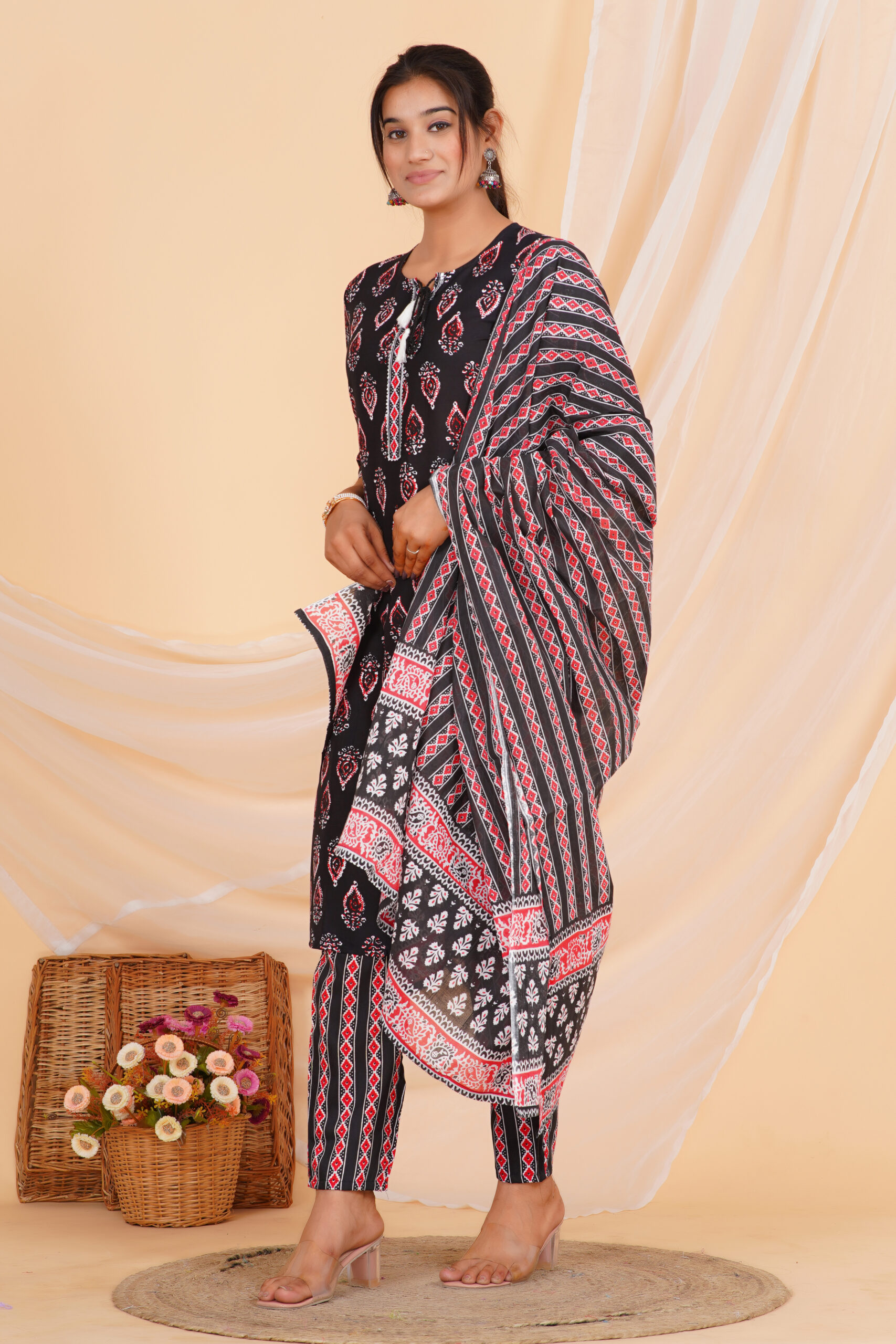 A striking kurta set designed in a deep black base, highlighted with classic red and white motifs that add depth and character. The straight-cut kurta is paired with coordinated printed pants and a beautifully patterned dupatta that completes the look with balanced contrast. Comfortable, breathable, and effortlessly stylish — perfect for daily ethnic wear with a refined edge.