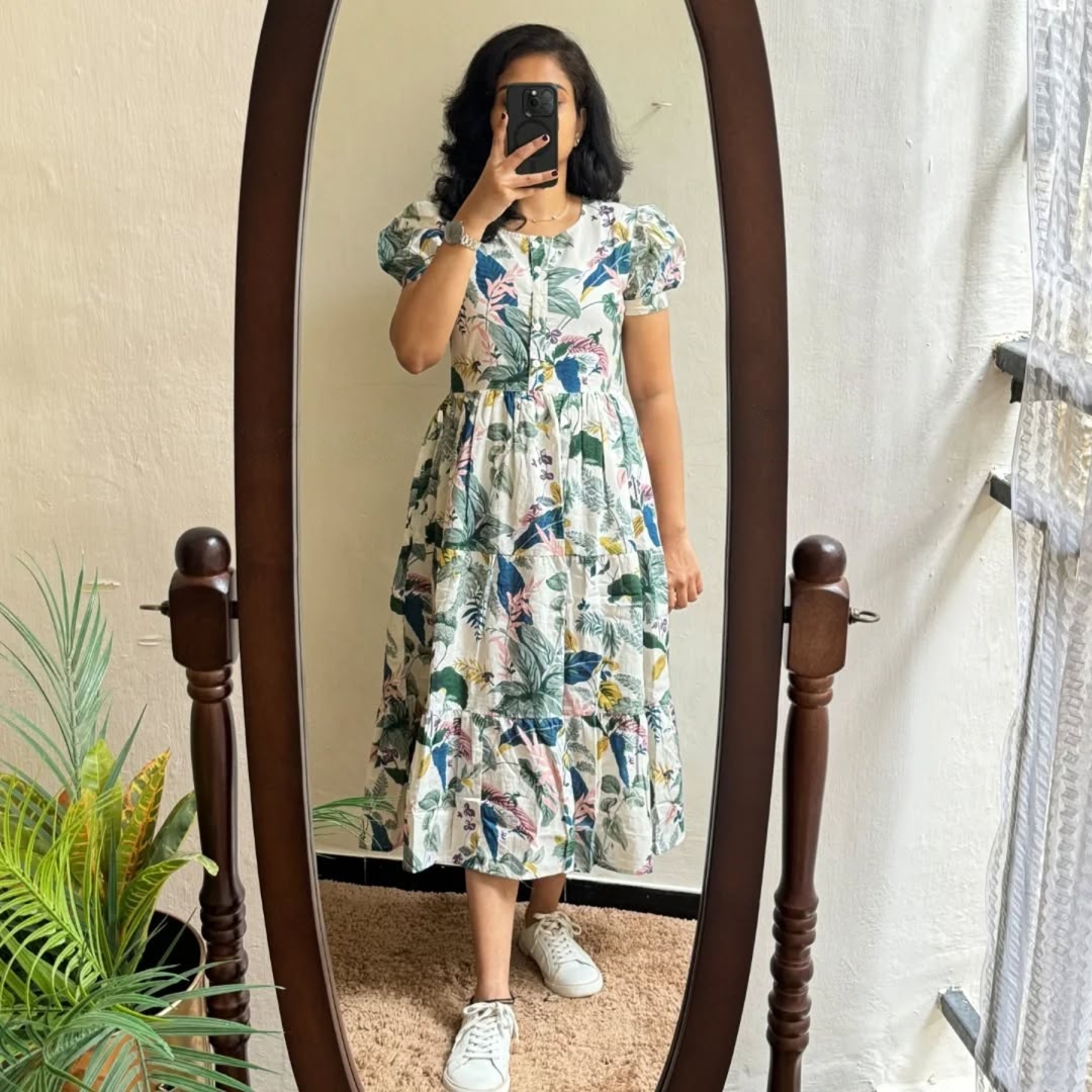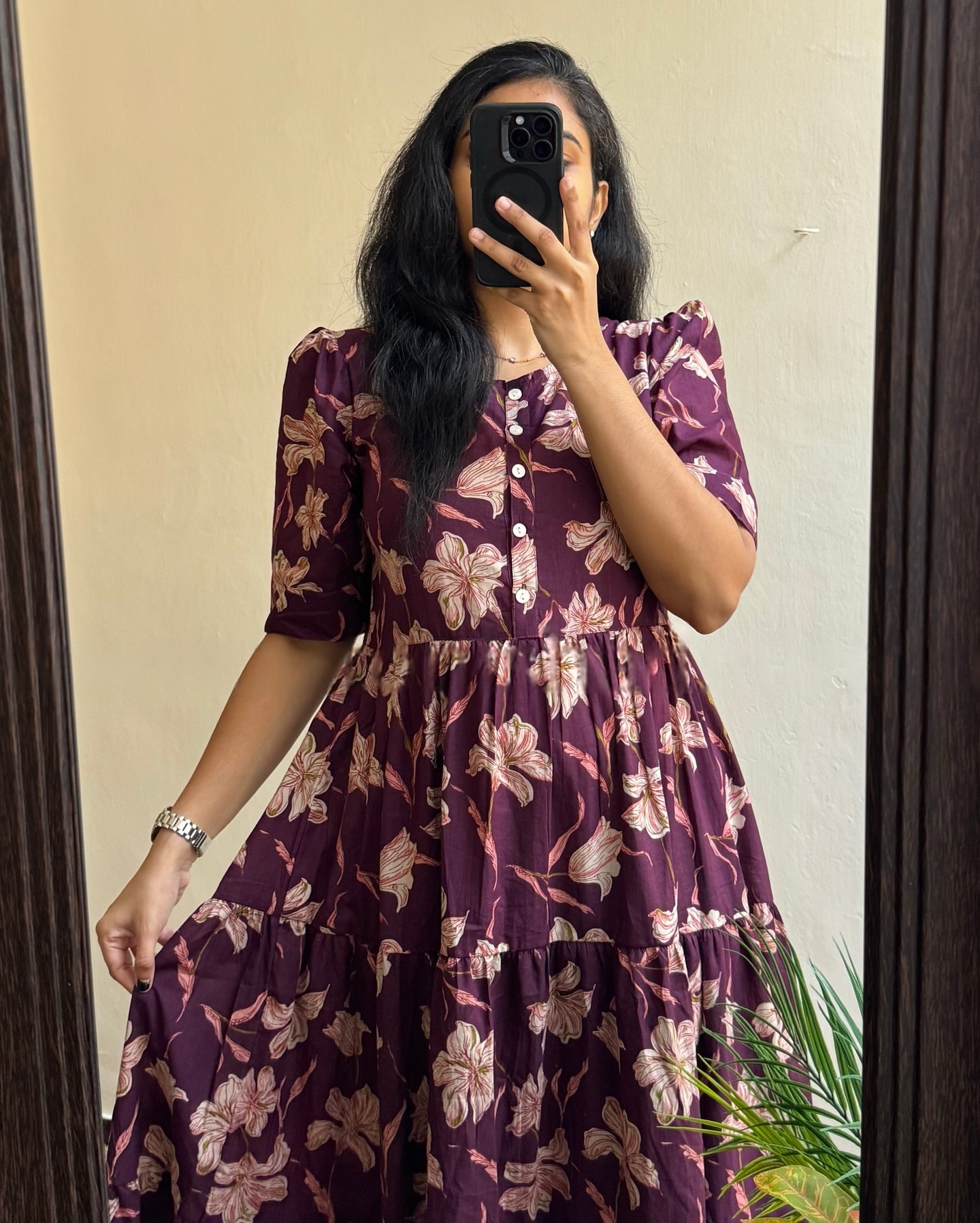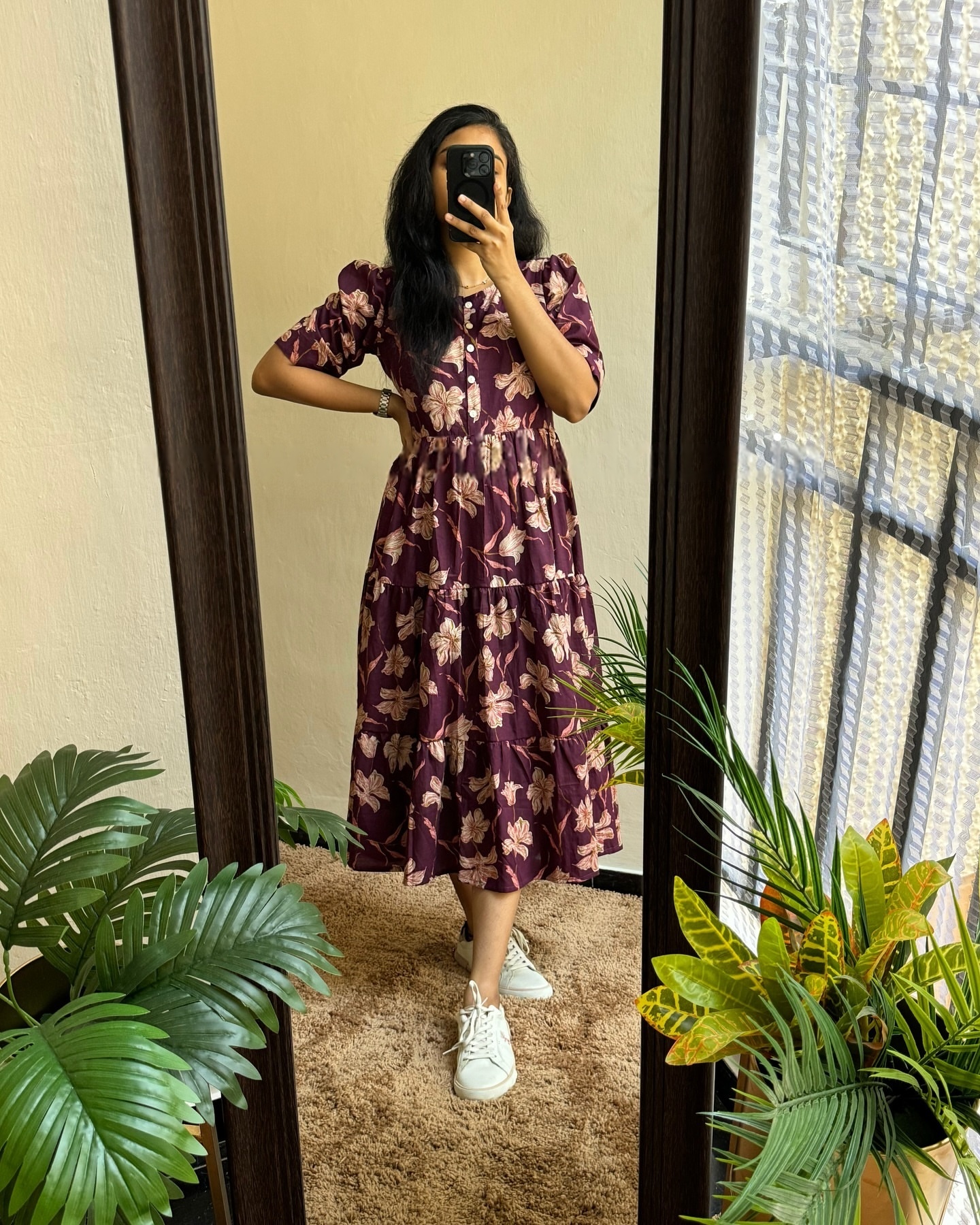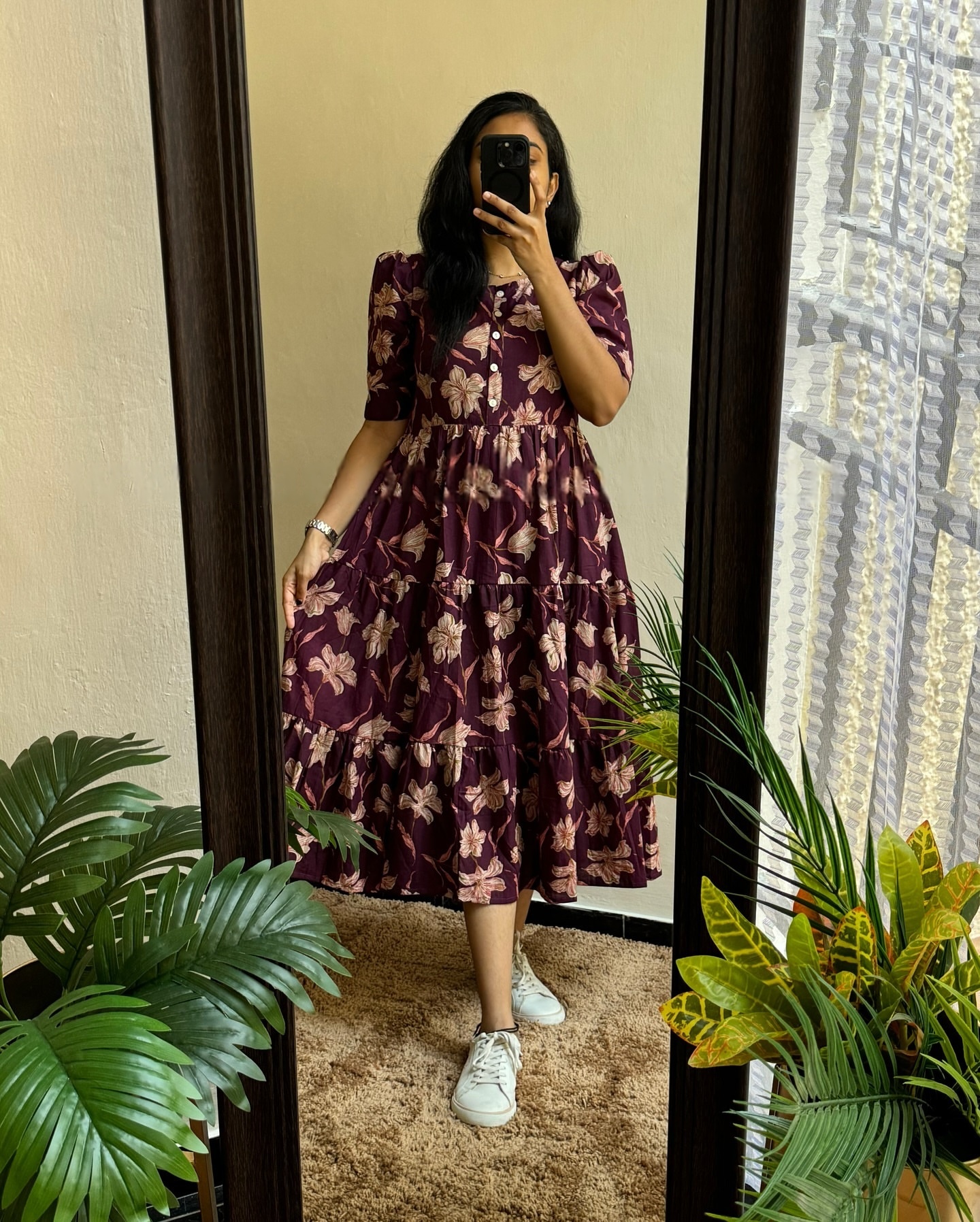 A graceful midi dress crafted in a rich mulberry purple wine hue, adorned with delicate floral prints for a refined feminine look. Designed with a classic round neckline, front button detailing, half sleeves, and a flowing tiered silhouette, this dress blends everyday comfort with understated elegance. Breathable, flattering, and versatile — a perfect choice for effortless daily styling.