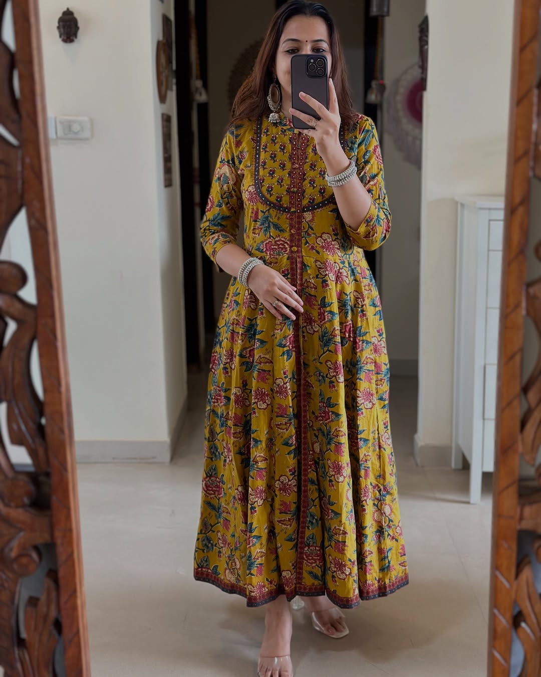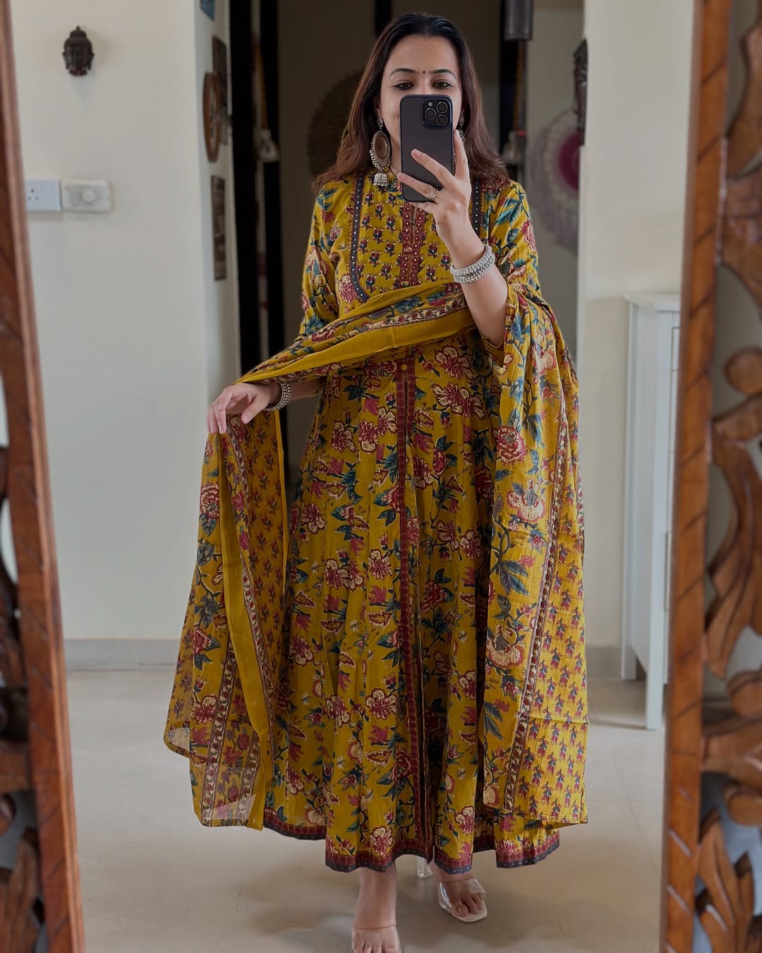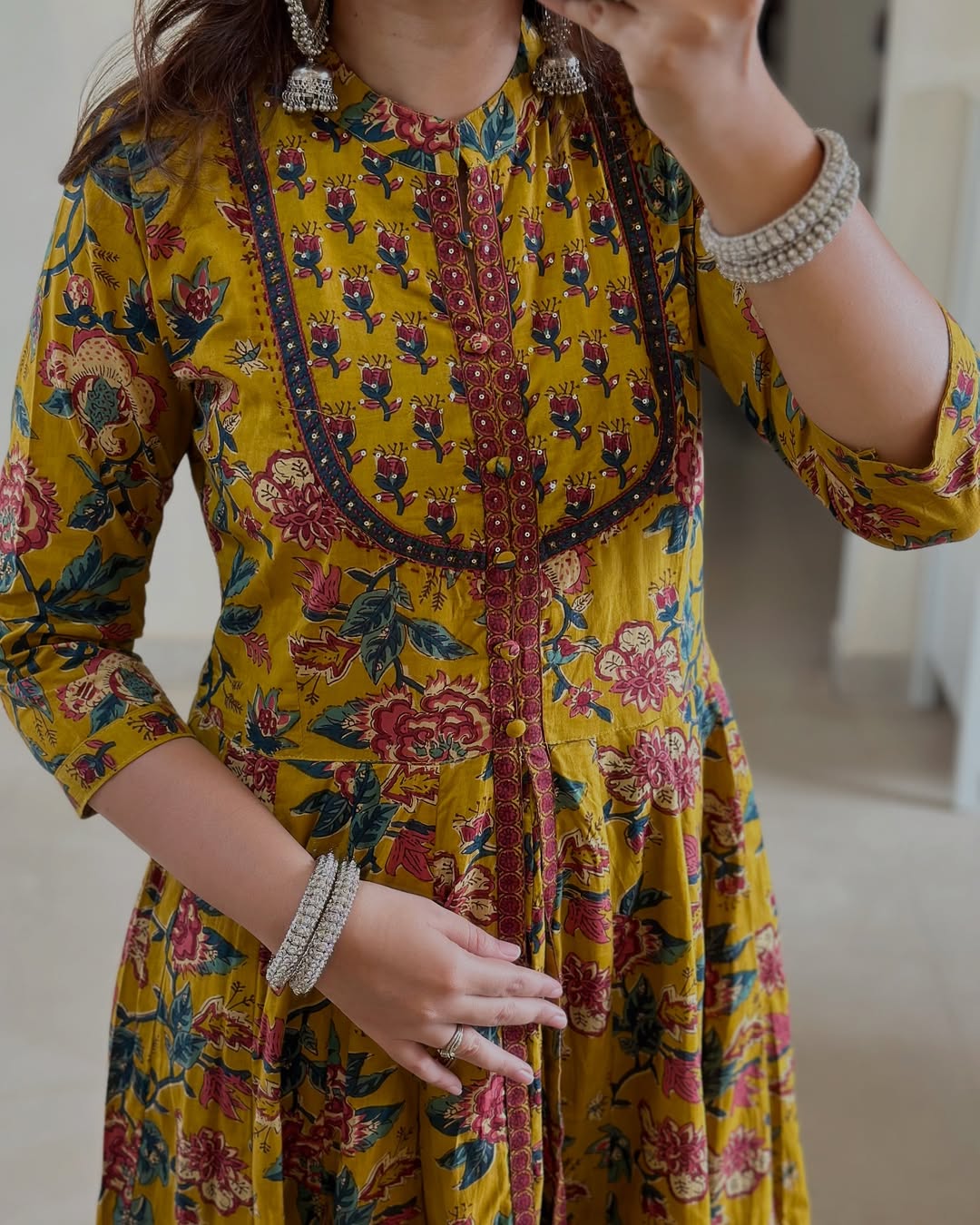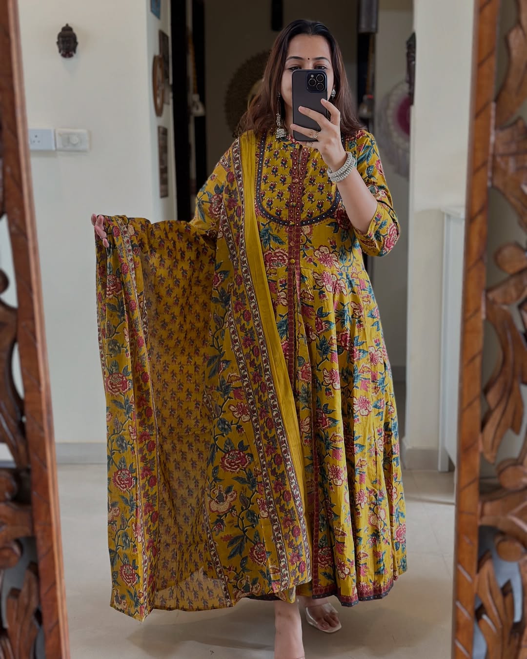 Mustard Yellow Floral Anarkali kurta set with matching bottom and dupatta, designed for festive elegance, graceful movement, and timeless ethnic style.