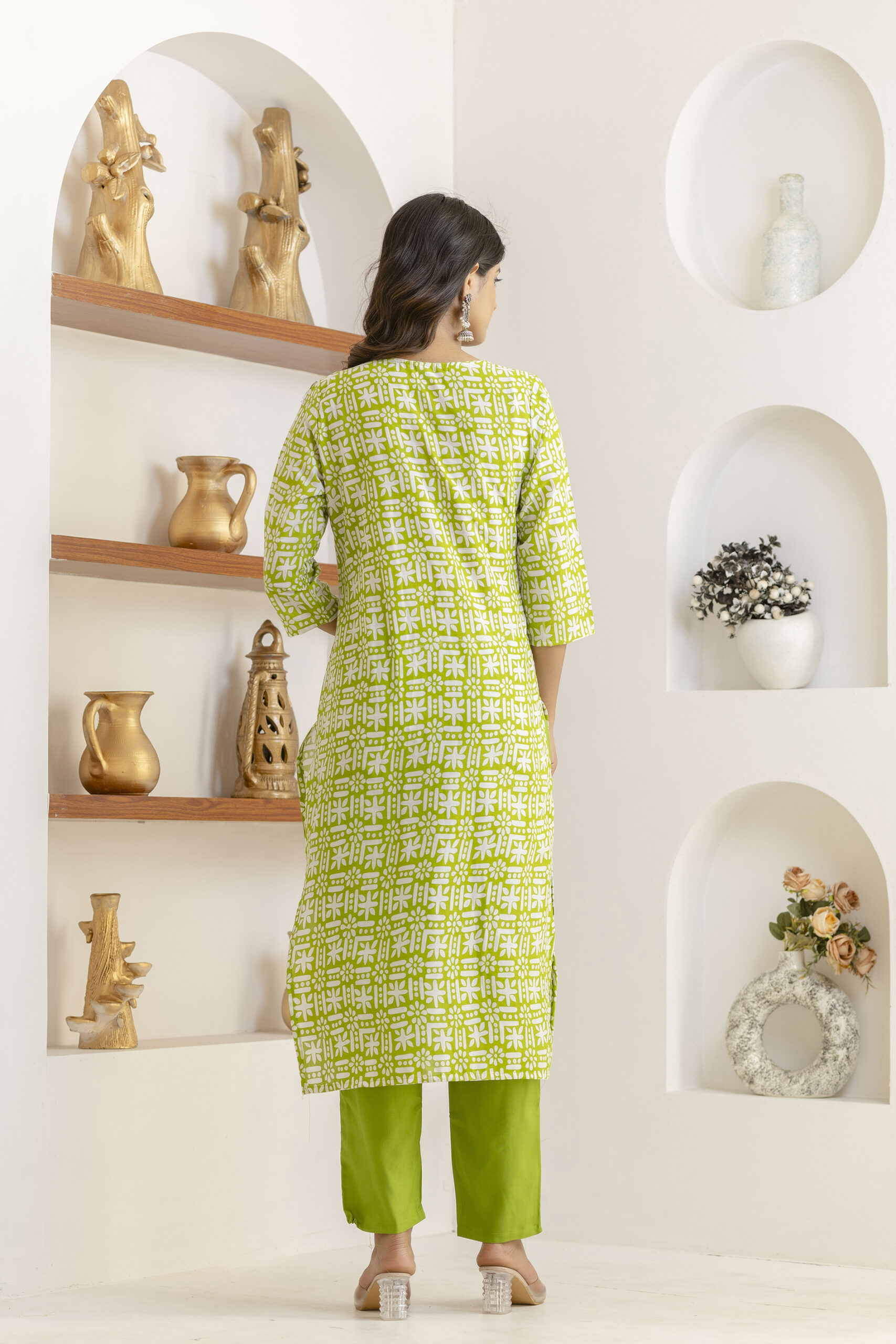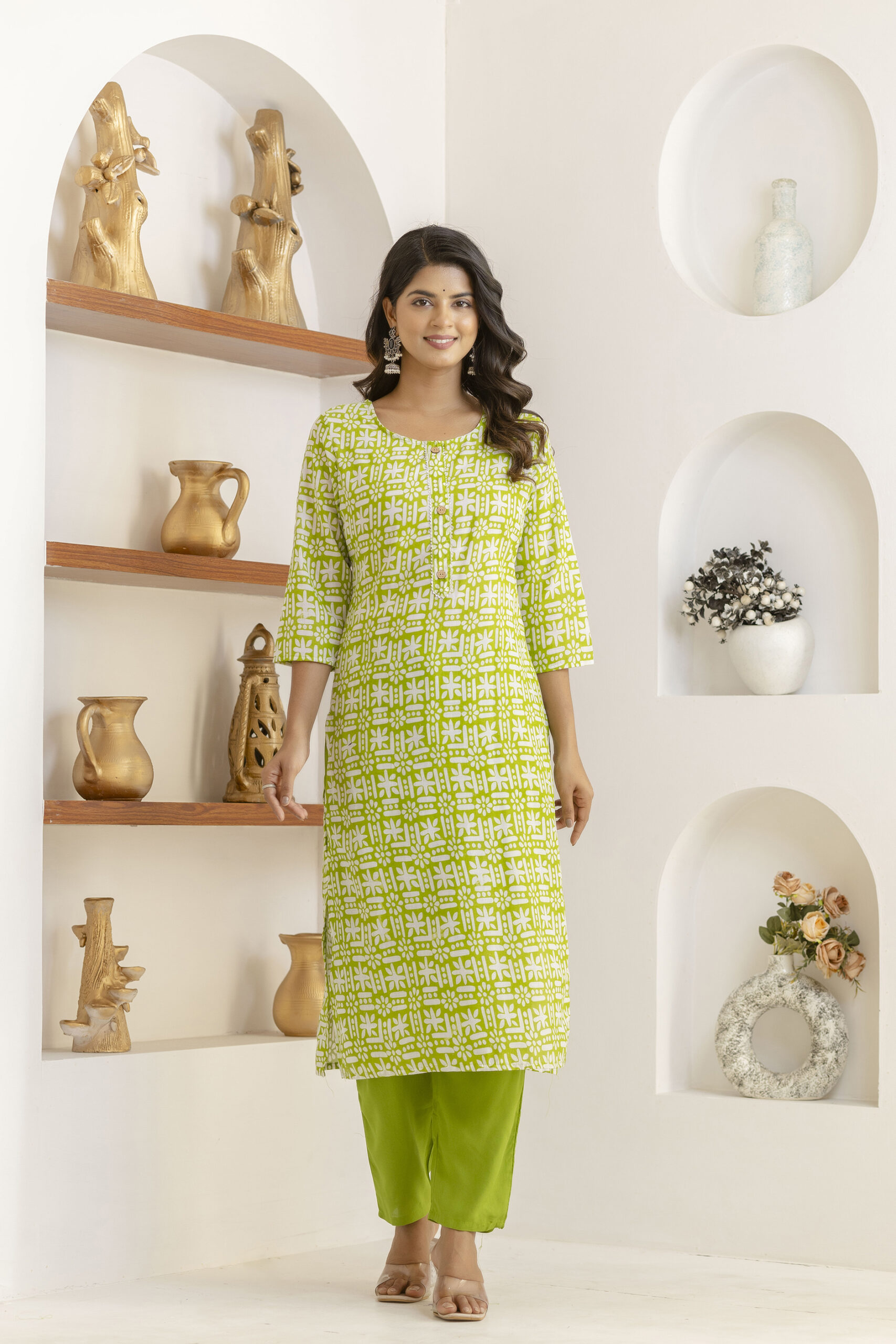 Bring effortless charm to your ethnic wardrobe with this olive green printed kurta set. Featuring delicate white block-inspired motifs, this straight-cut kurta is paired with matching green pants and a beautifully coordinated dupatta with traditional border detailing. Light, breathable, and soothing in tone, this set is perfect for everyday elegance and relaxed festive moments.
