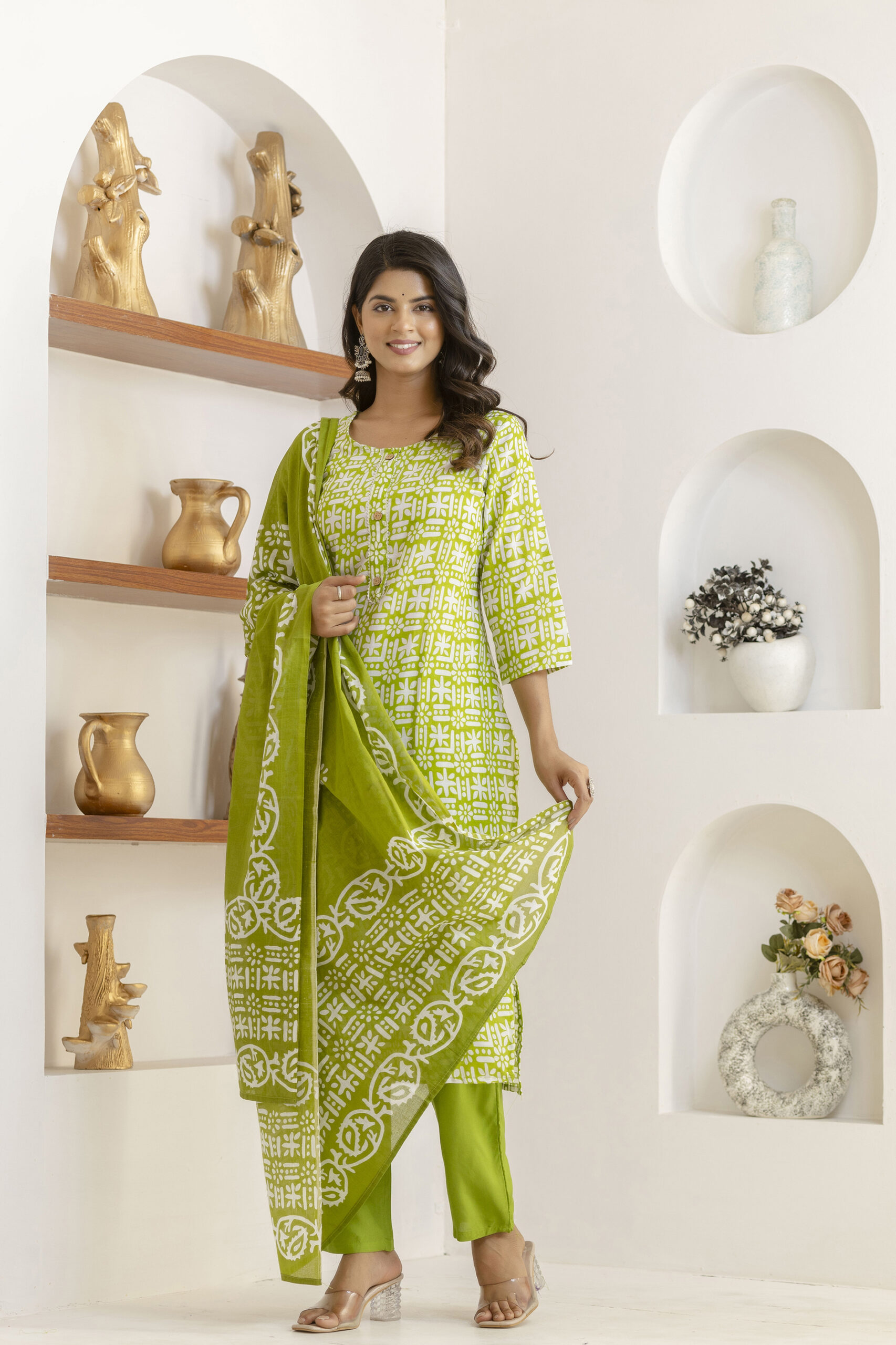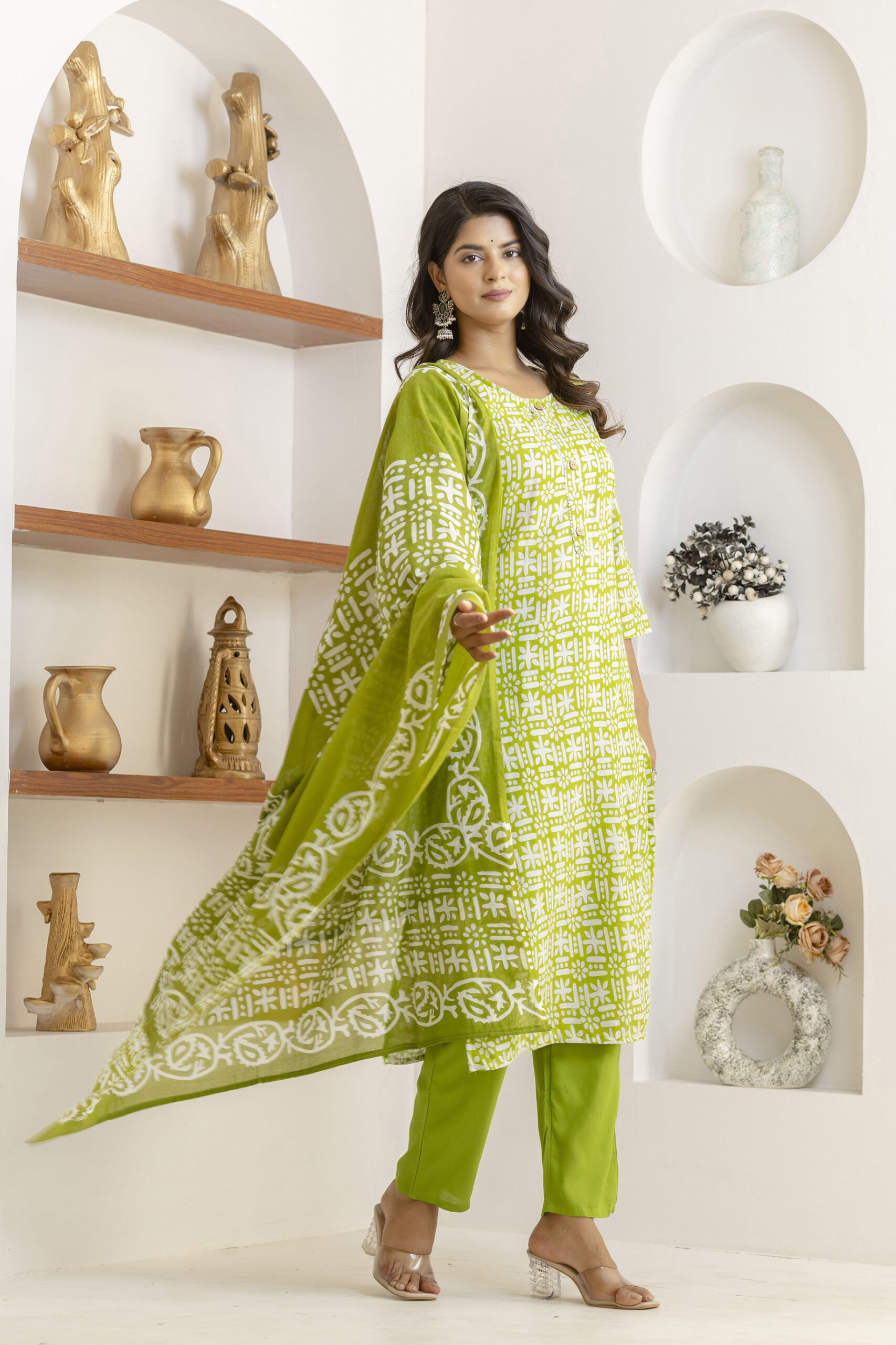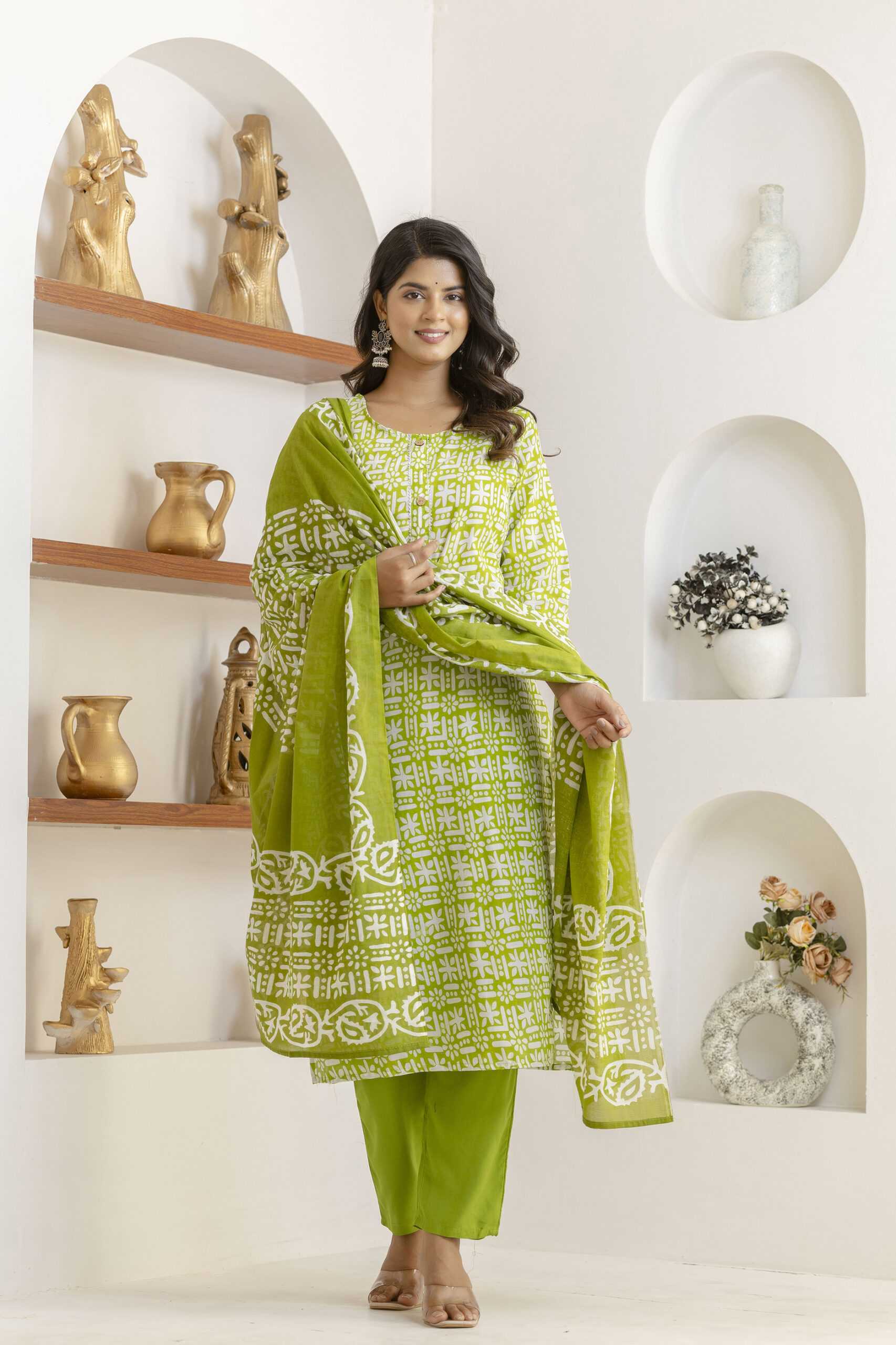 Olive green printed kurta set with matching pants and dupatta, crafted in breathable fabric for elegant everyday ethnic wear.