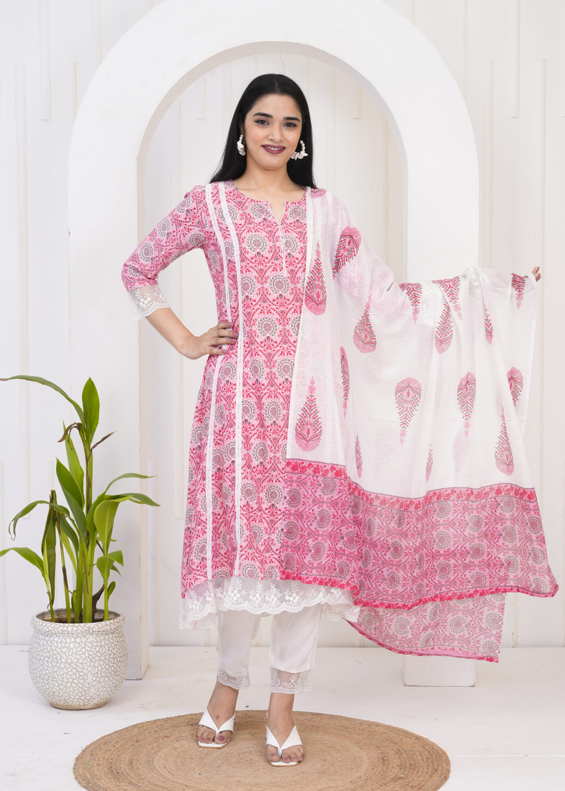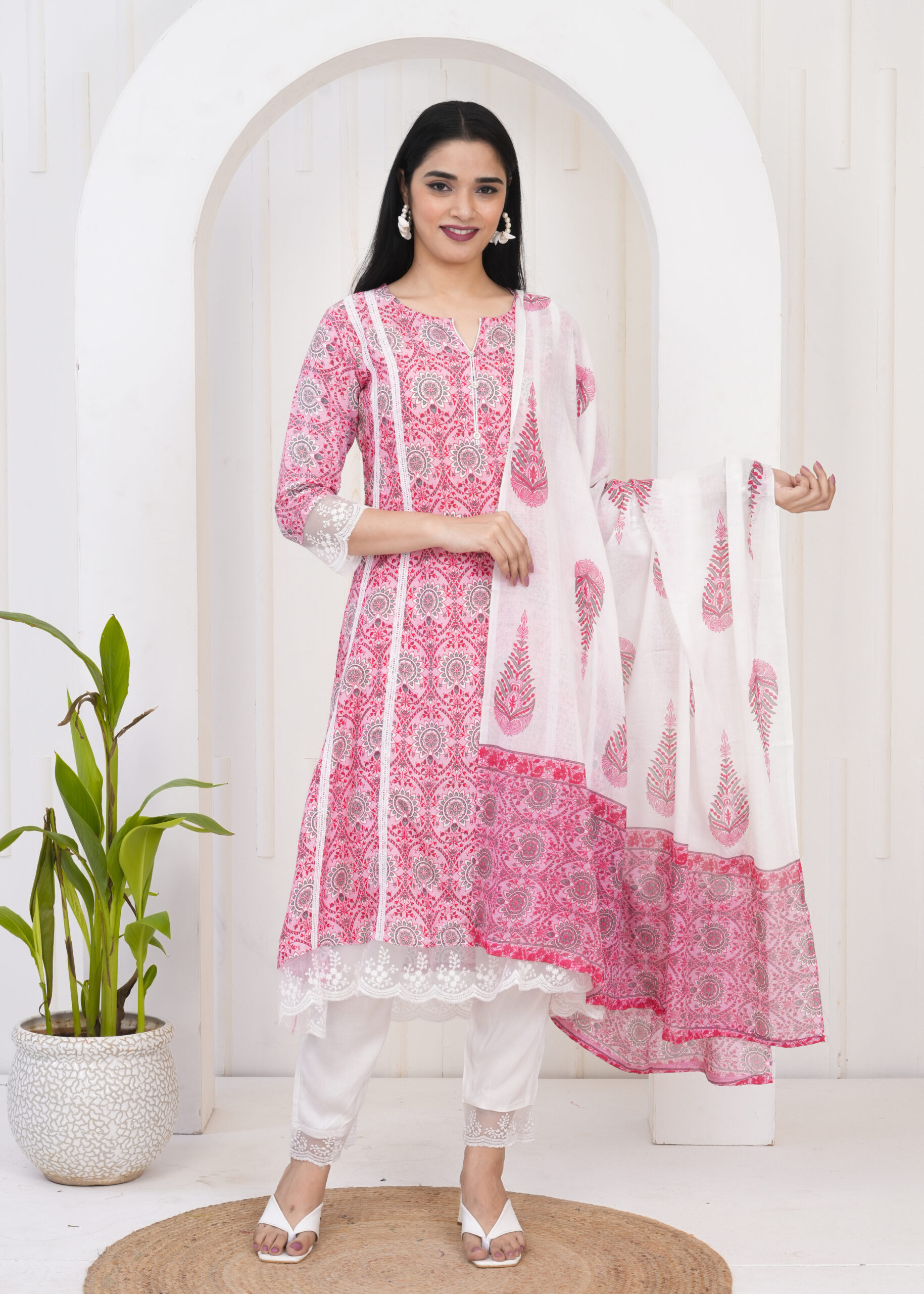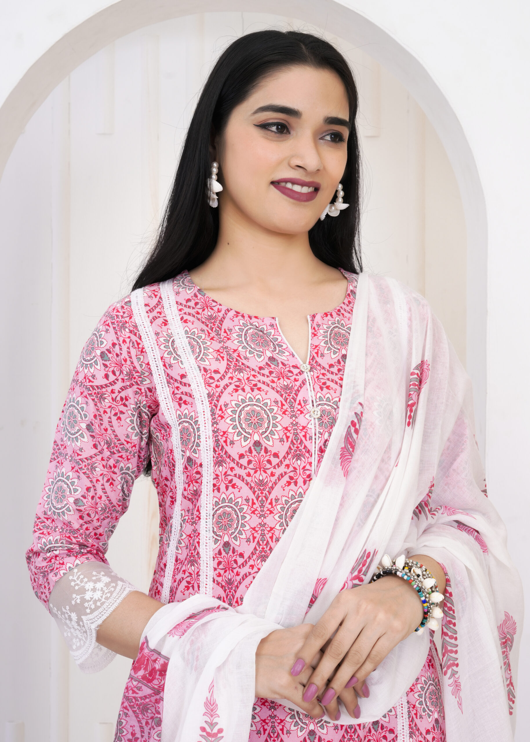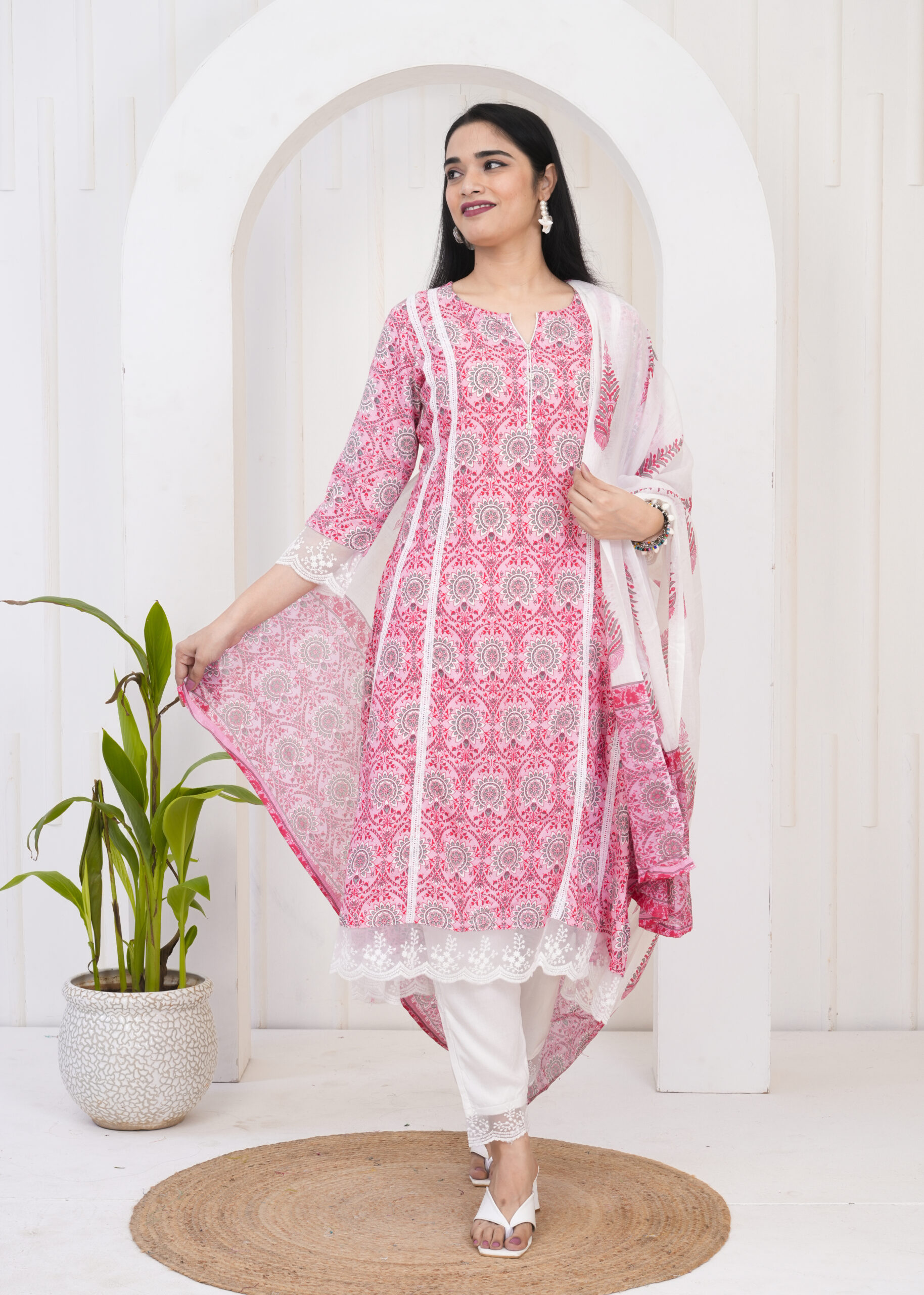 Pink floral printed kurta set with matching pants and a lightweight dupatta, perfect for office wear and everyday ethnic styling.