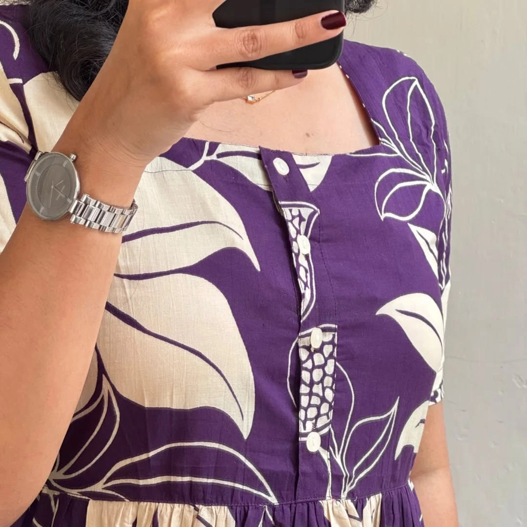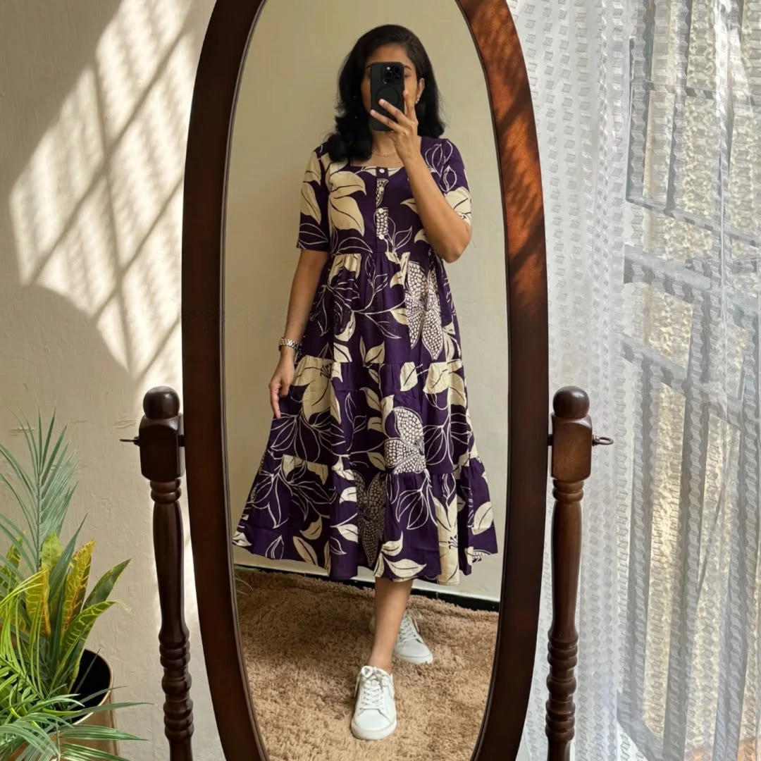 A beautifully designed midi dress in a rich plum purple base, highlighted with contrasting botanical prints for a bold yet refined look. Featuring a classic round neckline, comfortable half sleeves, and a softly flowing tiered silhouette, this dress blends everyday comfort with artistic charm. Easy to wear, breathable, and flattering — a standout piece for modern wardrobes.