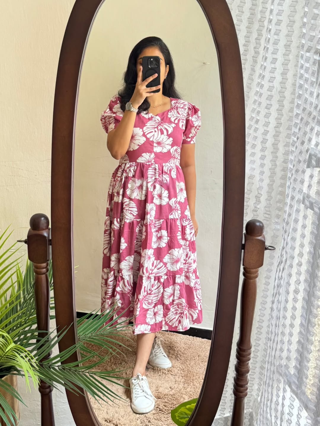 A beautifully printed tiered midi dress featuring a flattering fit-and-flare silhouette. Perfect for effortless everyday elegance.