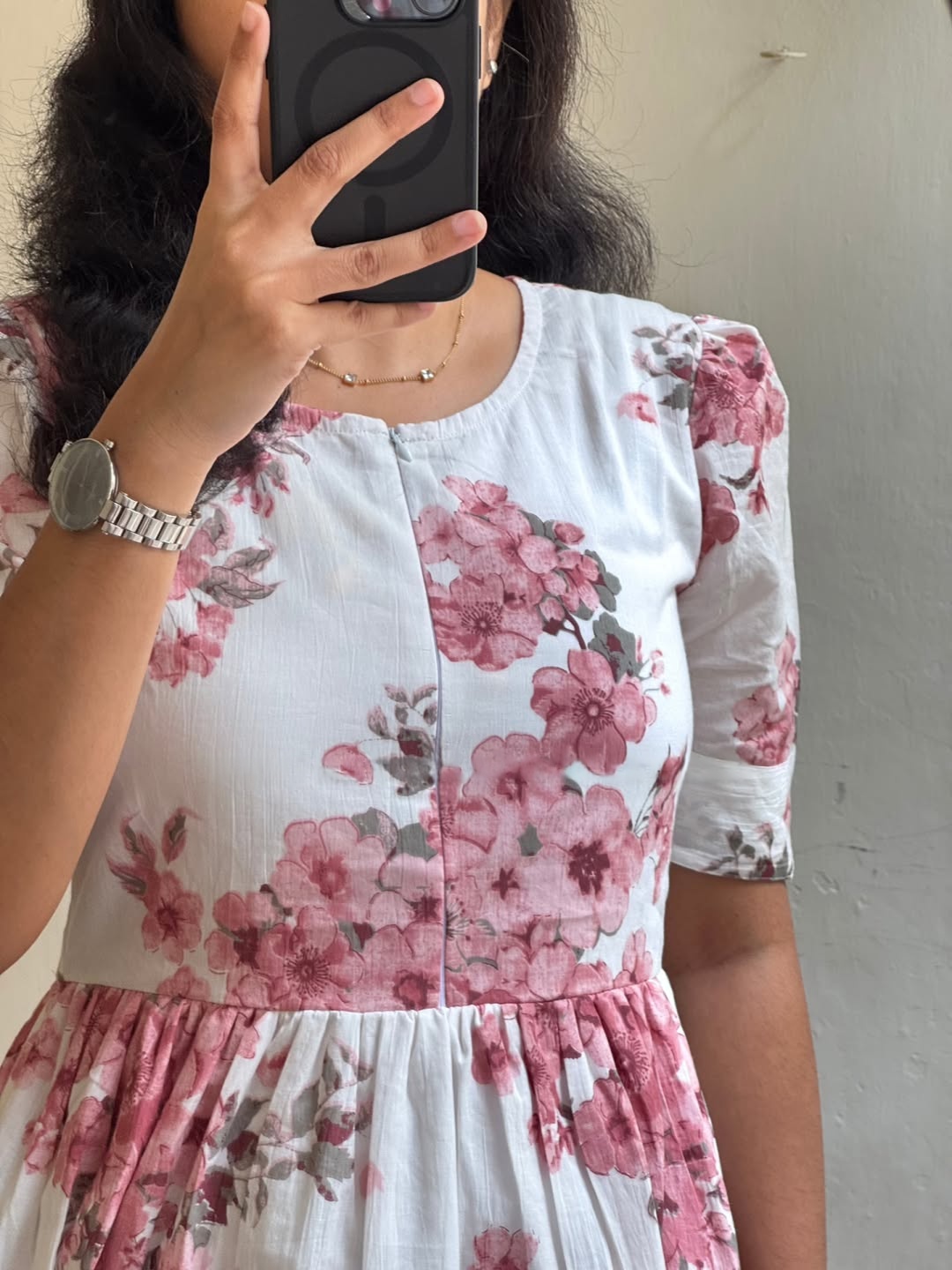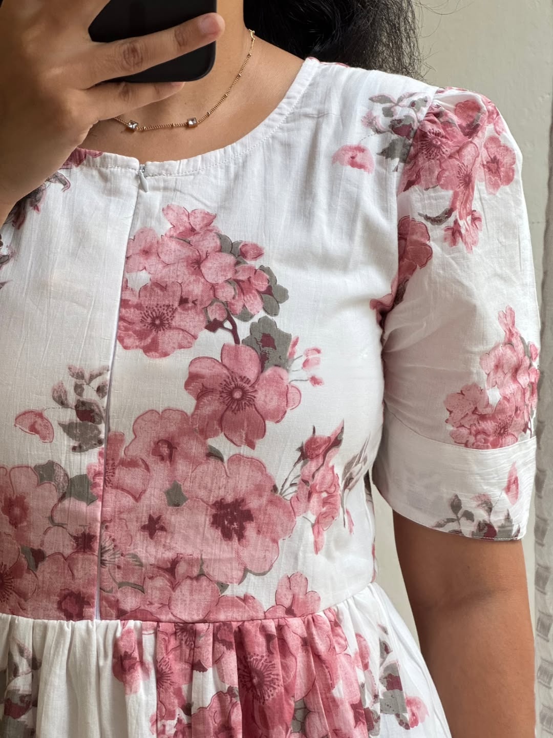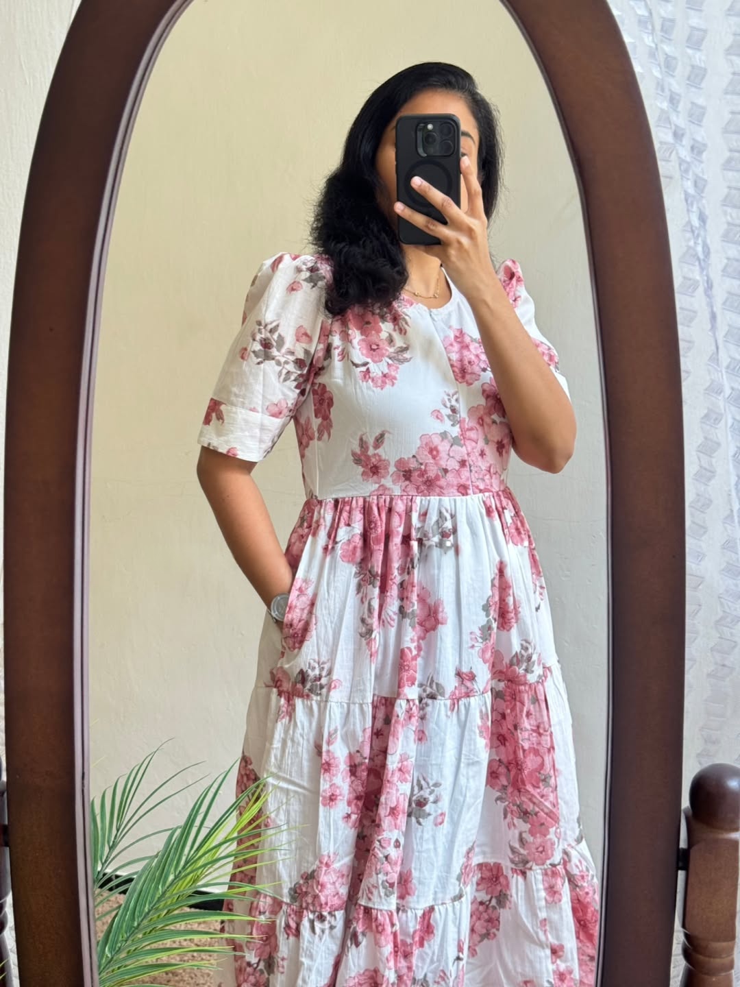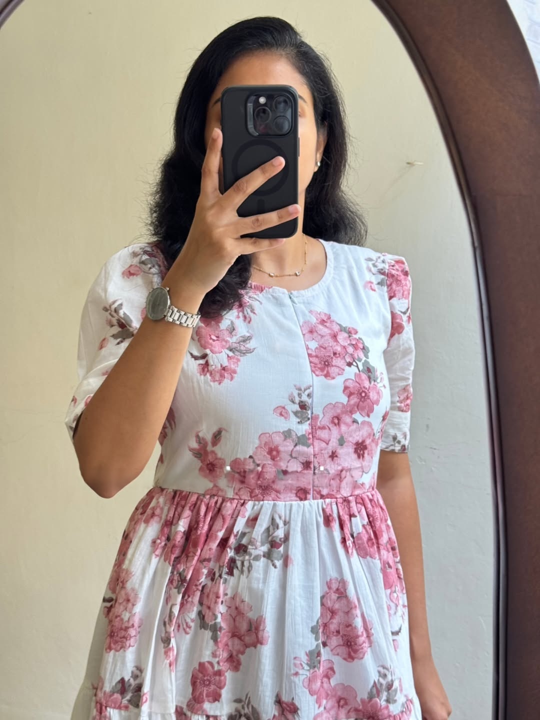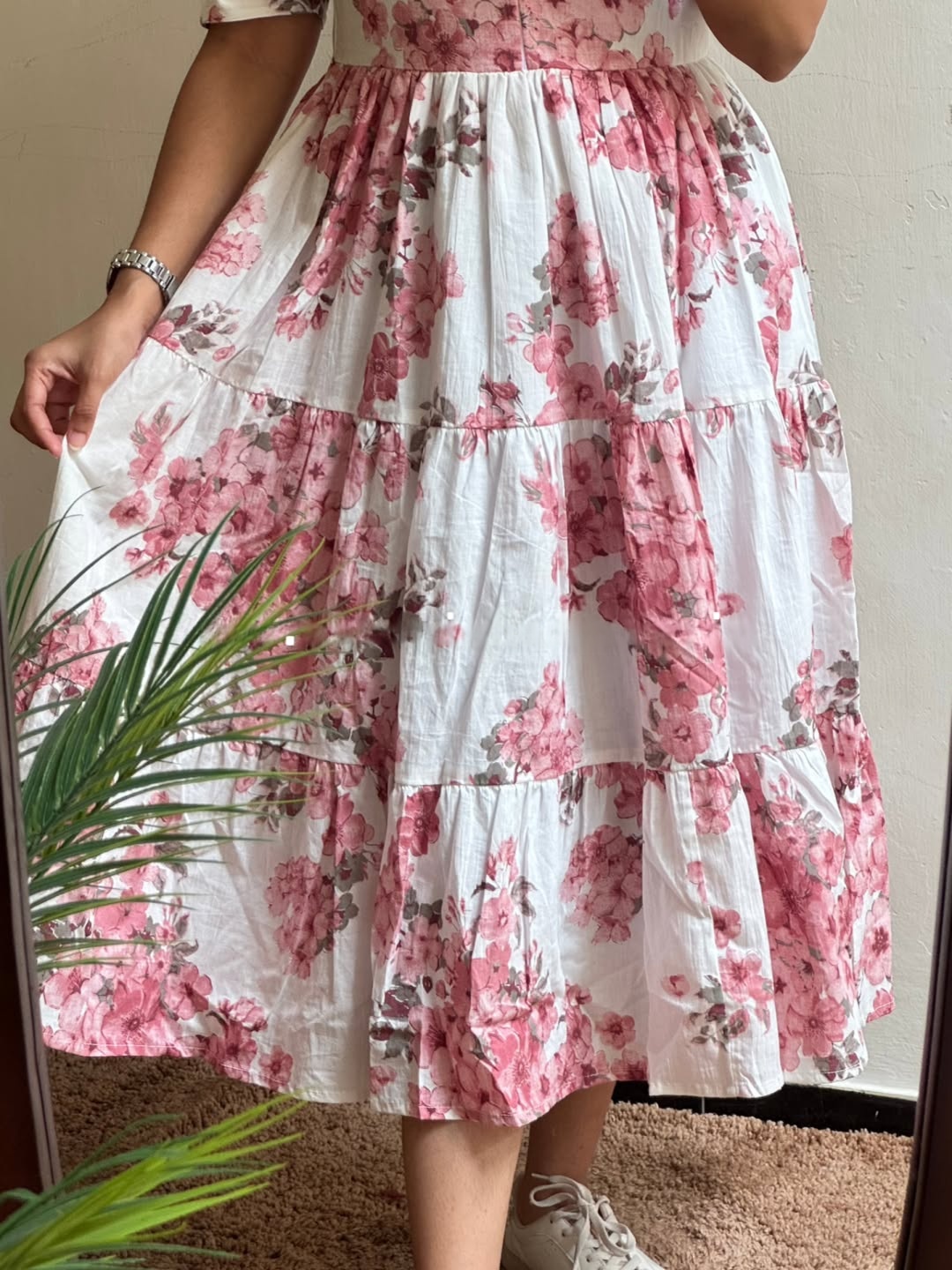 A graceful white midi dress adorned with soft pink floral prints, designed for effortless everyday elegance. Featuring a classic round neckline, short puff sleeves, and a flowing tiered silhouette, this dress blends comfort with romantic charm. Light, breathable, and flattering — perfect for days when you want to feel polished yet relaxed.