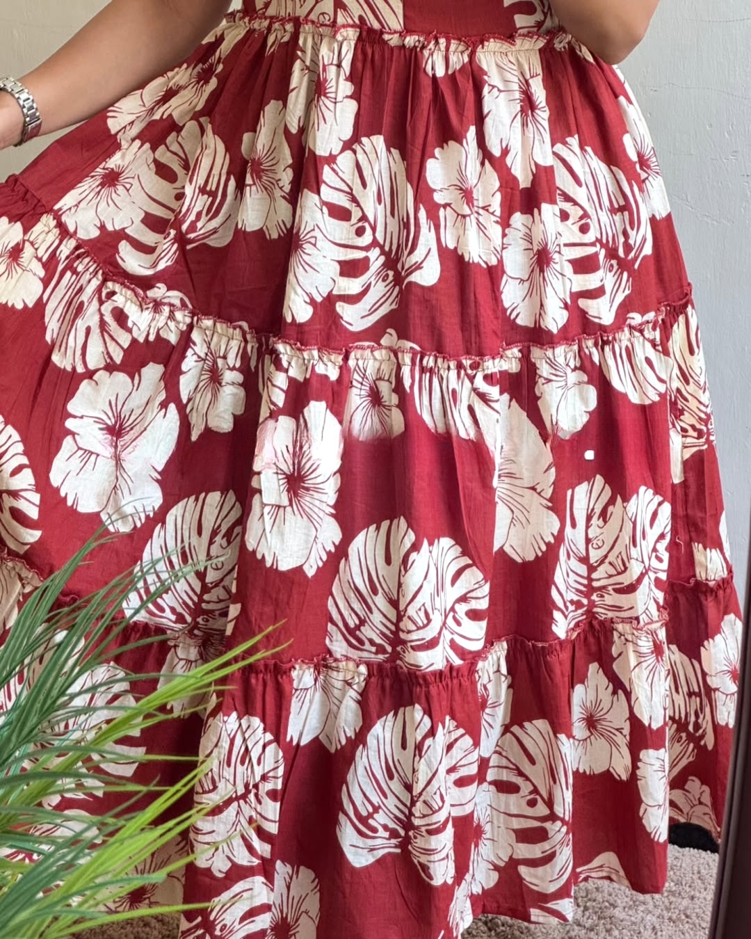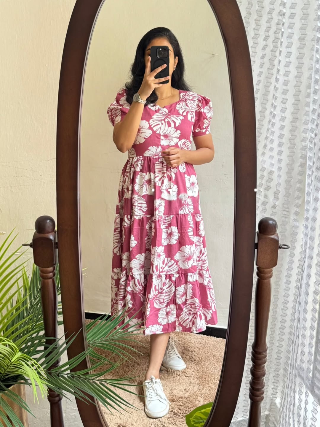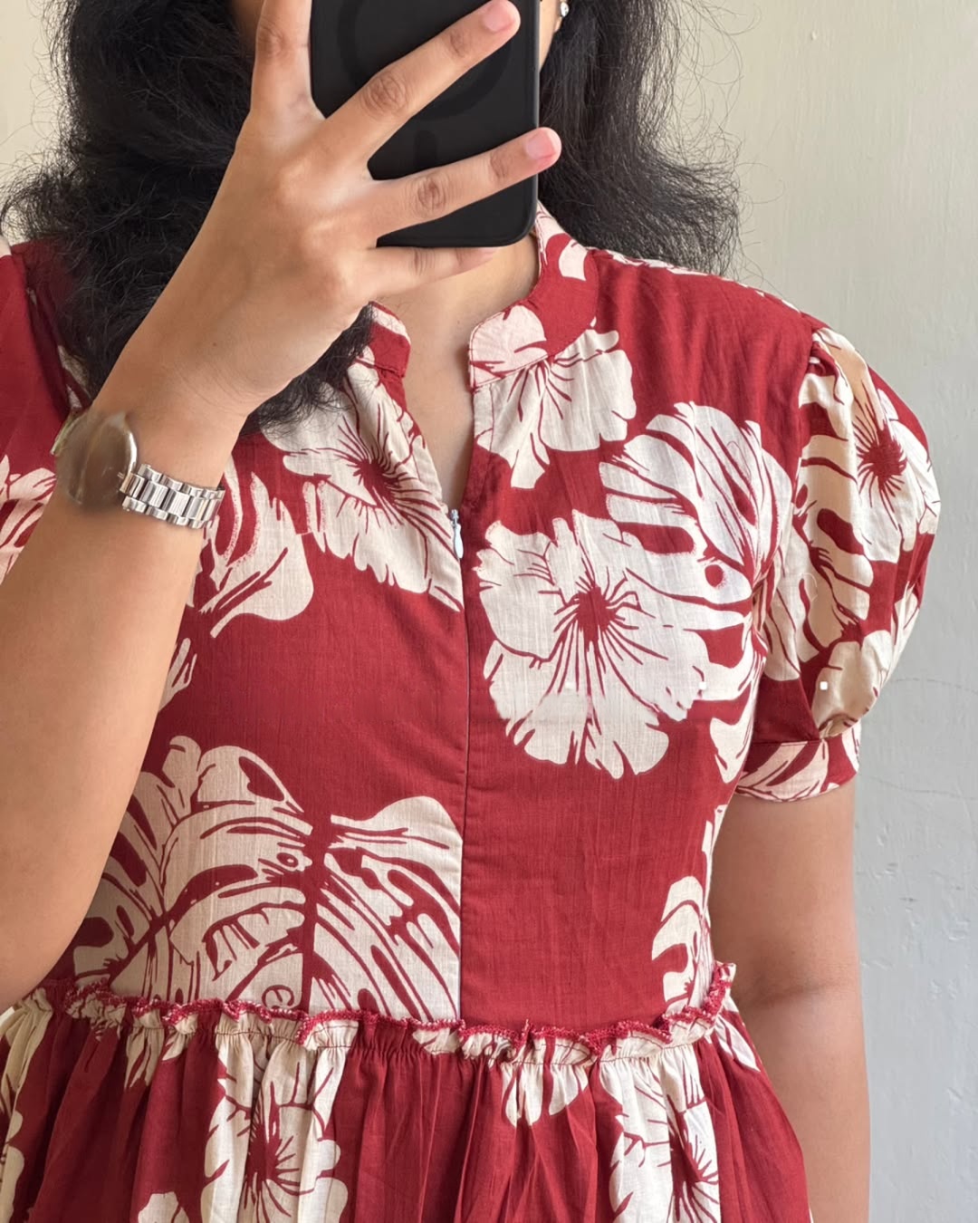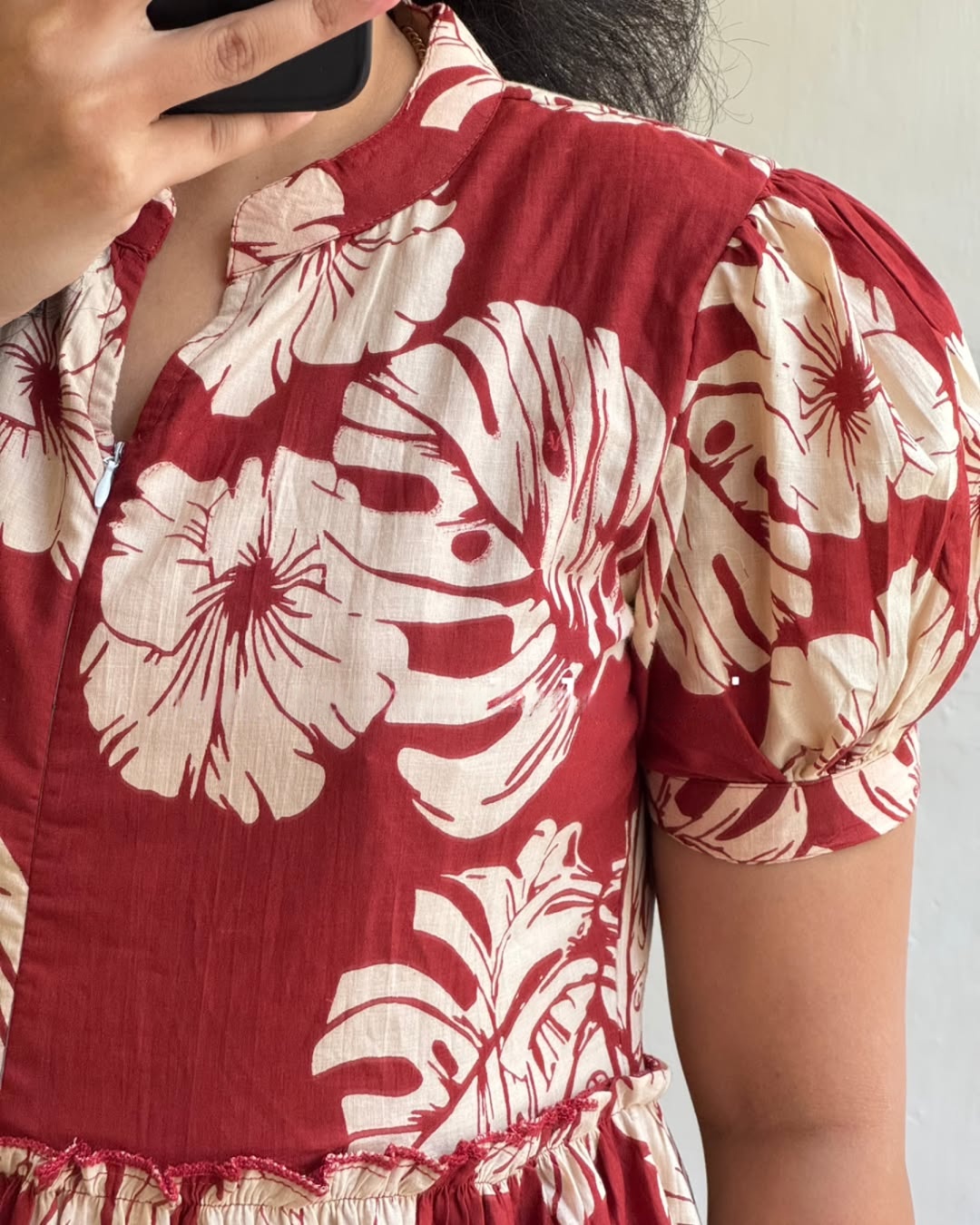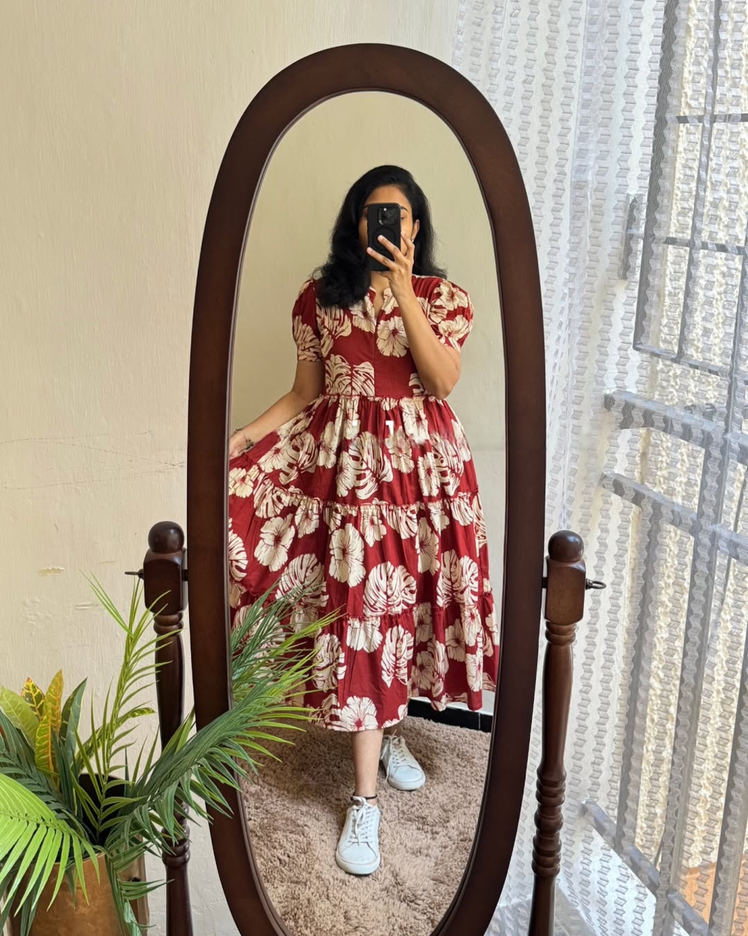 A statement midi dress in a rich rosewood RED hue, adorned with oversized white floral prints for a striking yet feminine look. Designed with a classic round neckline, soft puff sleeves, and a flowing tiered silhouette, this dress offers comfort with standout style. Effortless, breathable, and flattering — perfect for everyday wear with a confident twist.