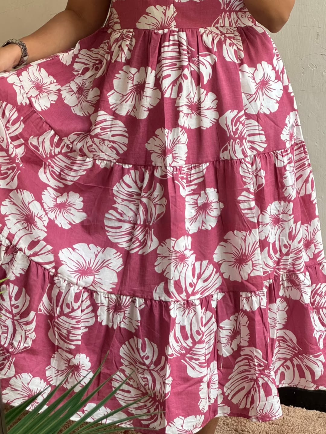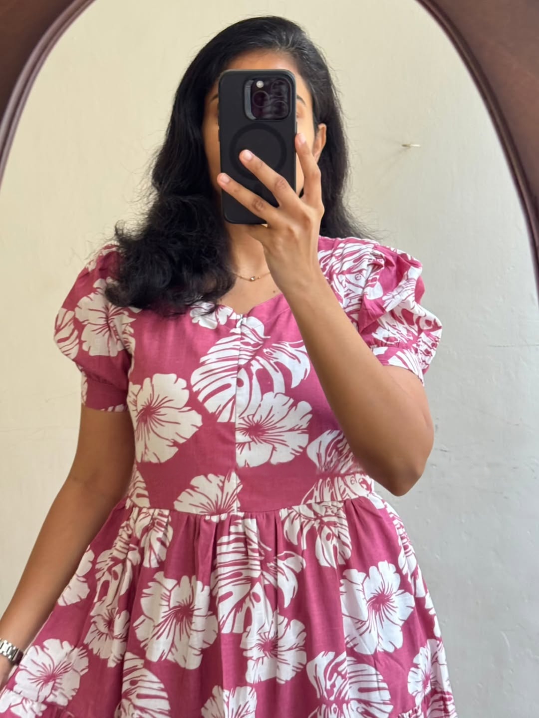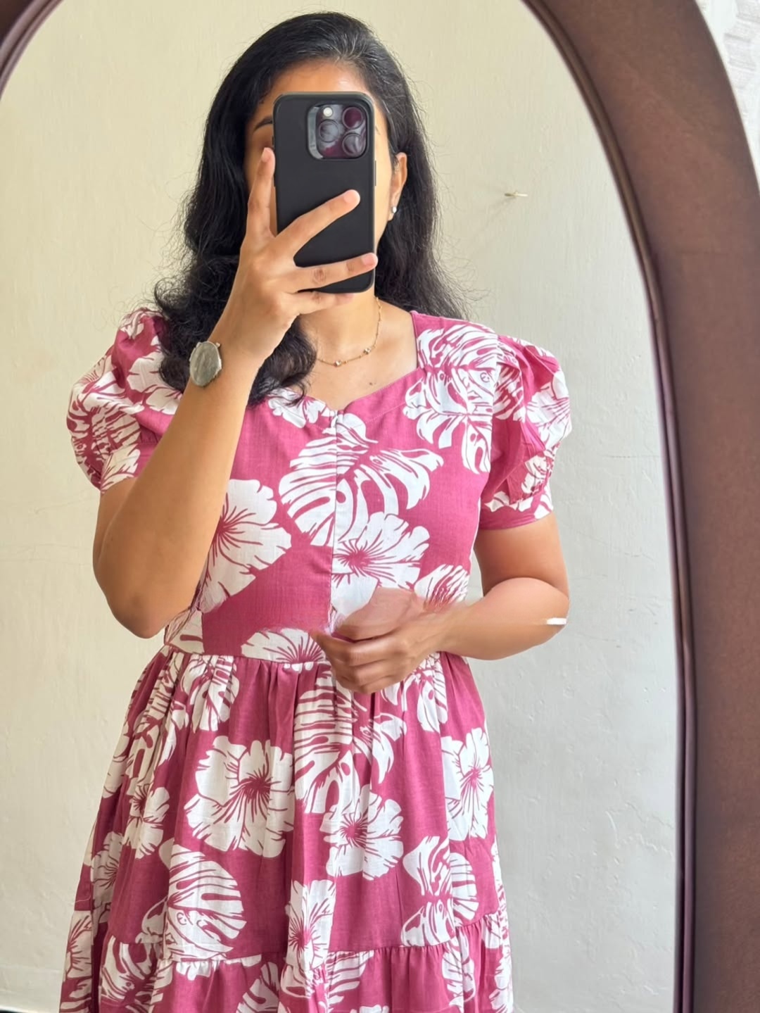Pink floral tiered midi dress with puff sleeves and a round neckline, crafted in a lightweight breathable fabric. Perfect for casual outings, brunch wear, and everyday elegant styling.
