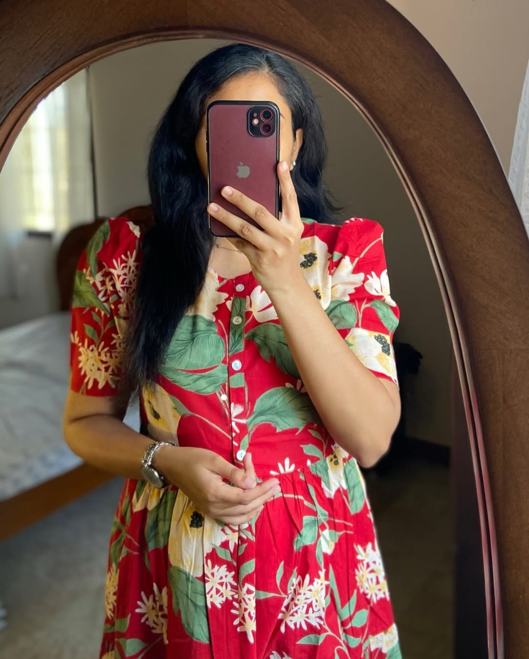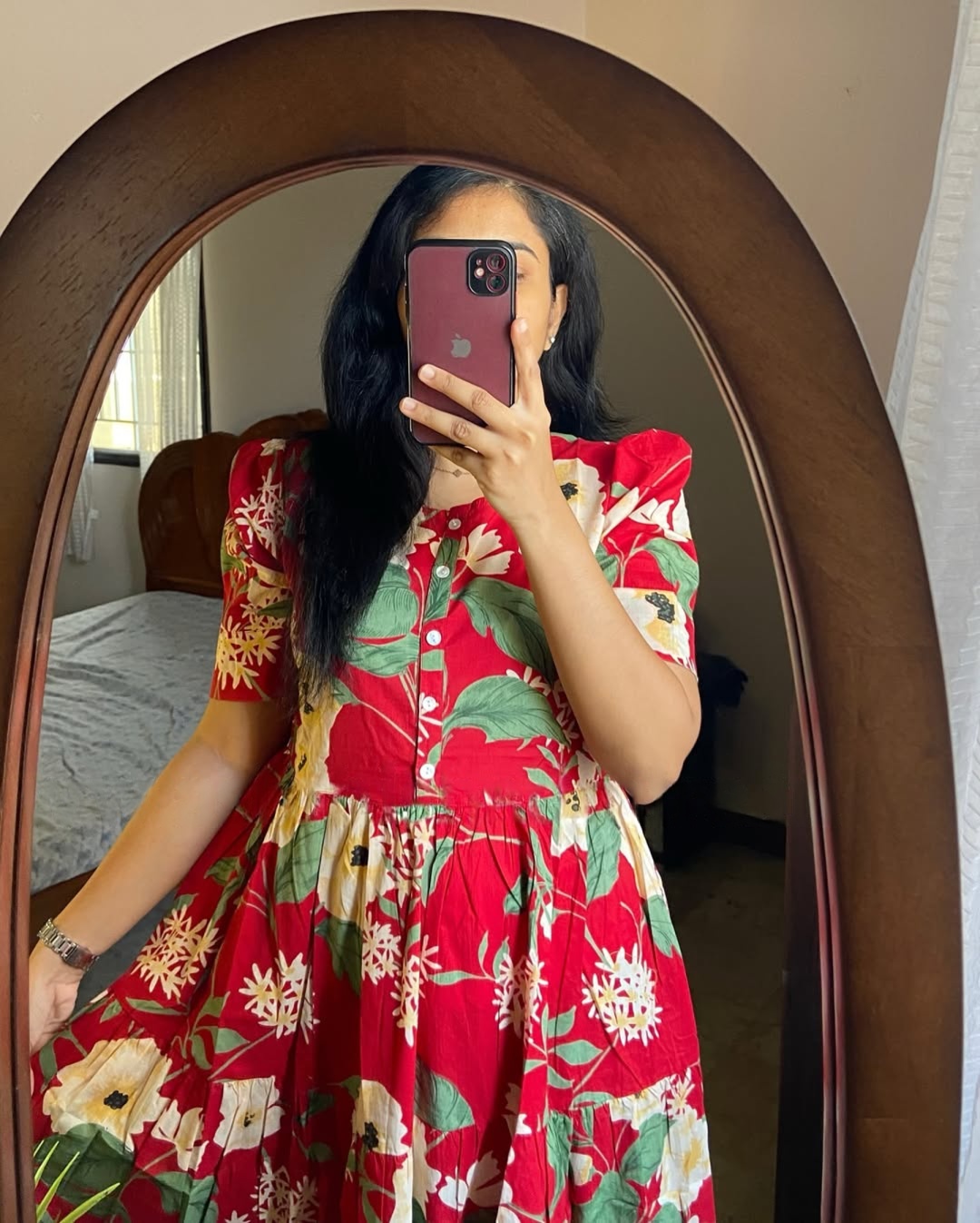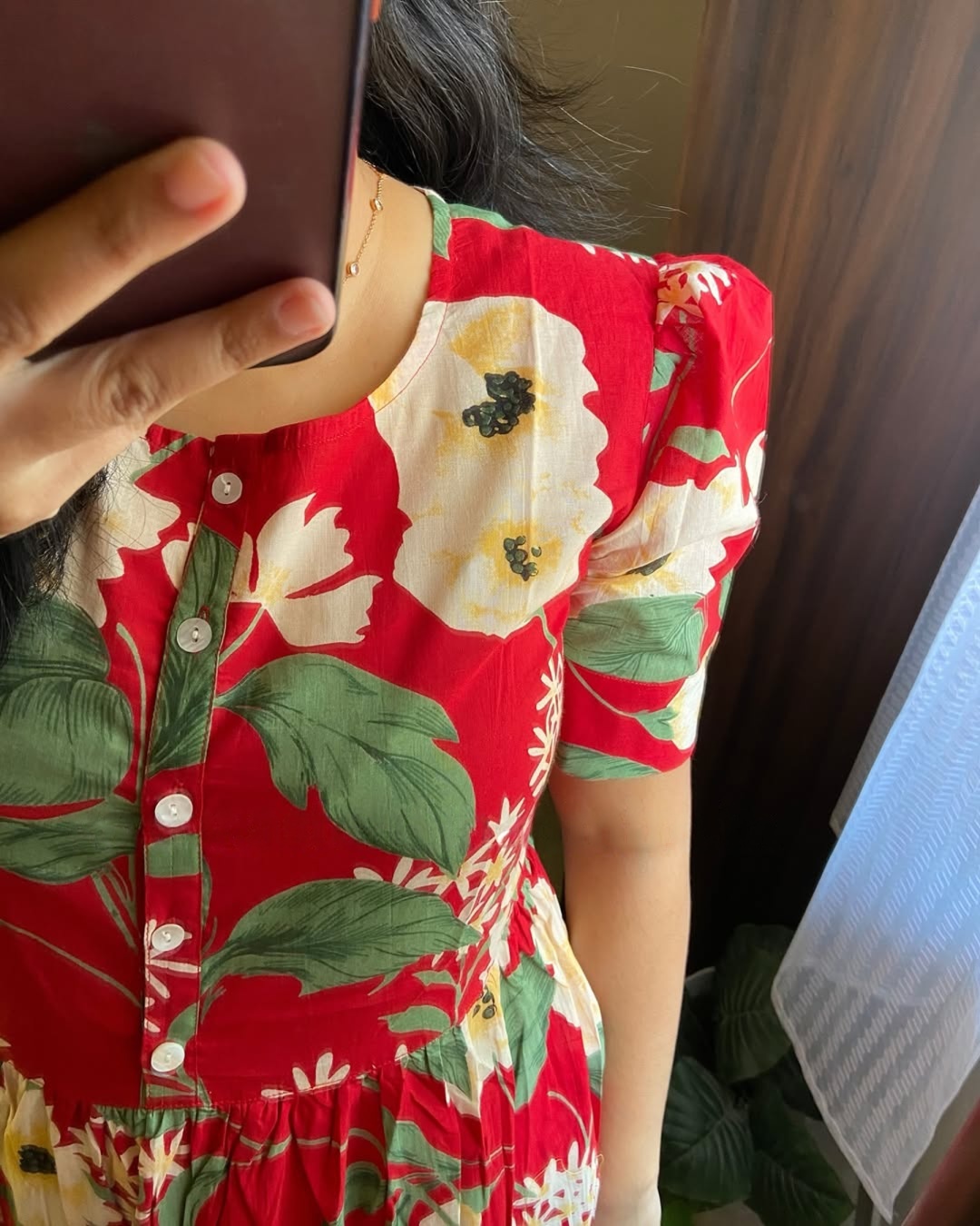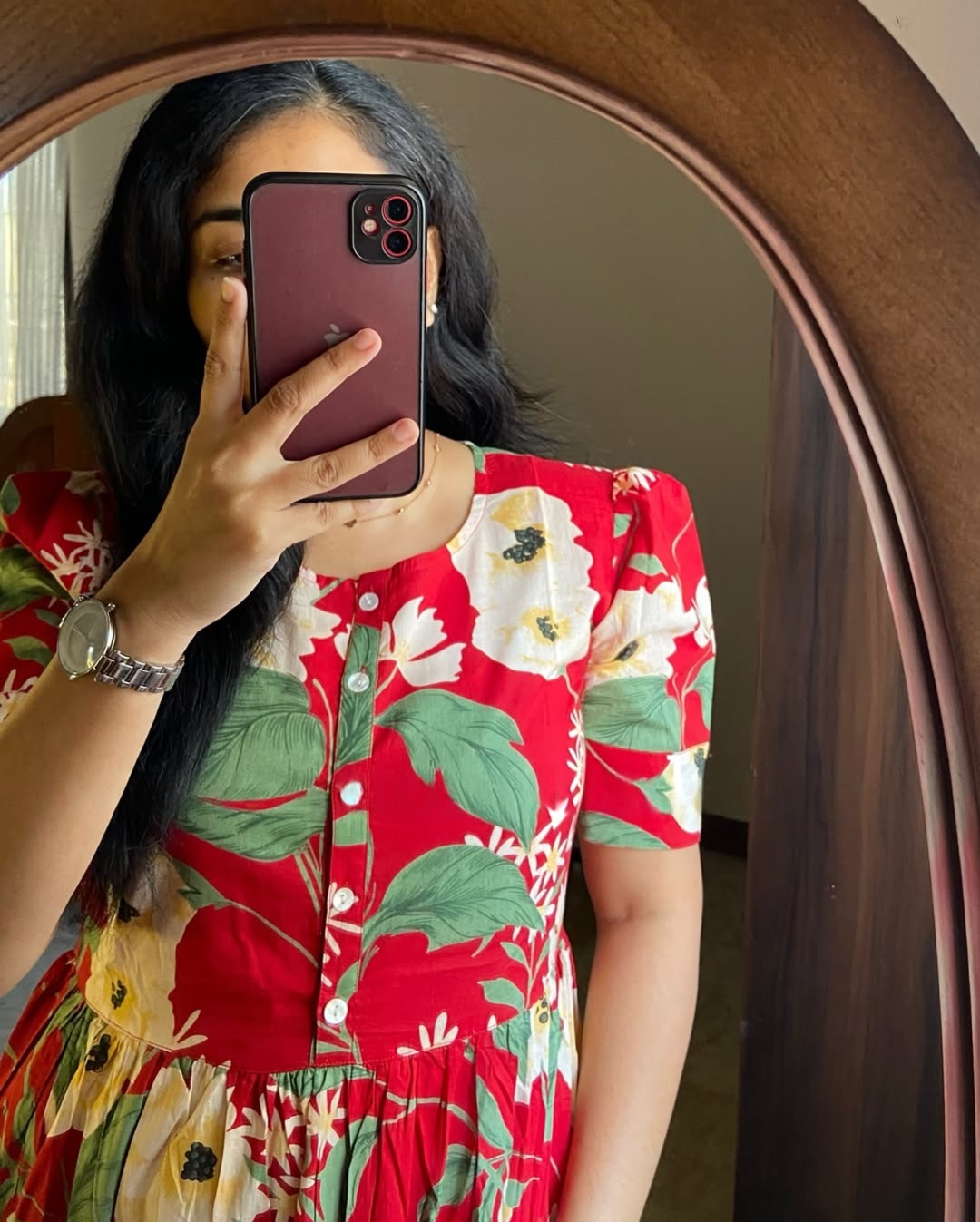 A striking midi dress crafted in a rich scarlet red base, adorned with lively multicolor floral prints for a bold yet balanced look. Designed with a classic round neckline, front button detailing, short sleeves, and a flowing tiered silhouette, this dress blends comfort with standout charm. Light, breathable, and full of character — perfect for festive days and joyful everyday wear.